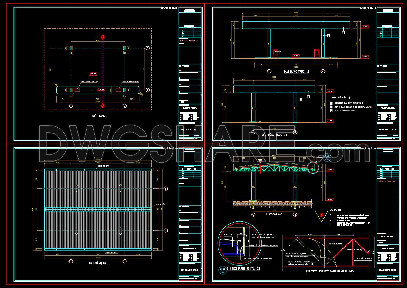 This CAD drawing set presents a complete gas station design with detailed architectural and structural documentation. The drawings include the overall site master plan, clearly showing traffic circulation, functional zoning, and spatial organization of the station. Detailed drawings of the fuel pump canopy illustrate the plan, elevations, roof layout, and structural sections, ensuring accuracy for fabrication and installation.