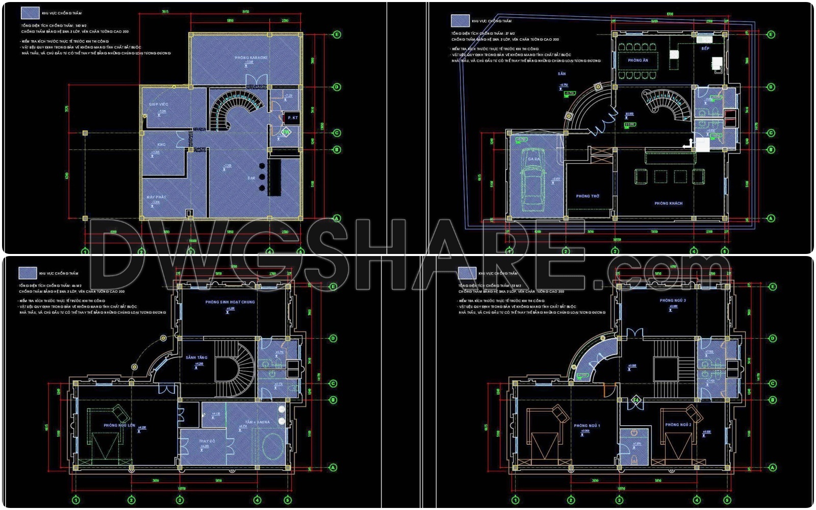 This CAD drawing set is a complete waterproofing design for a multi-storey residential building, covering the basement, first floor, second floor, and third floor.