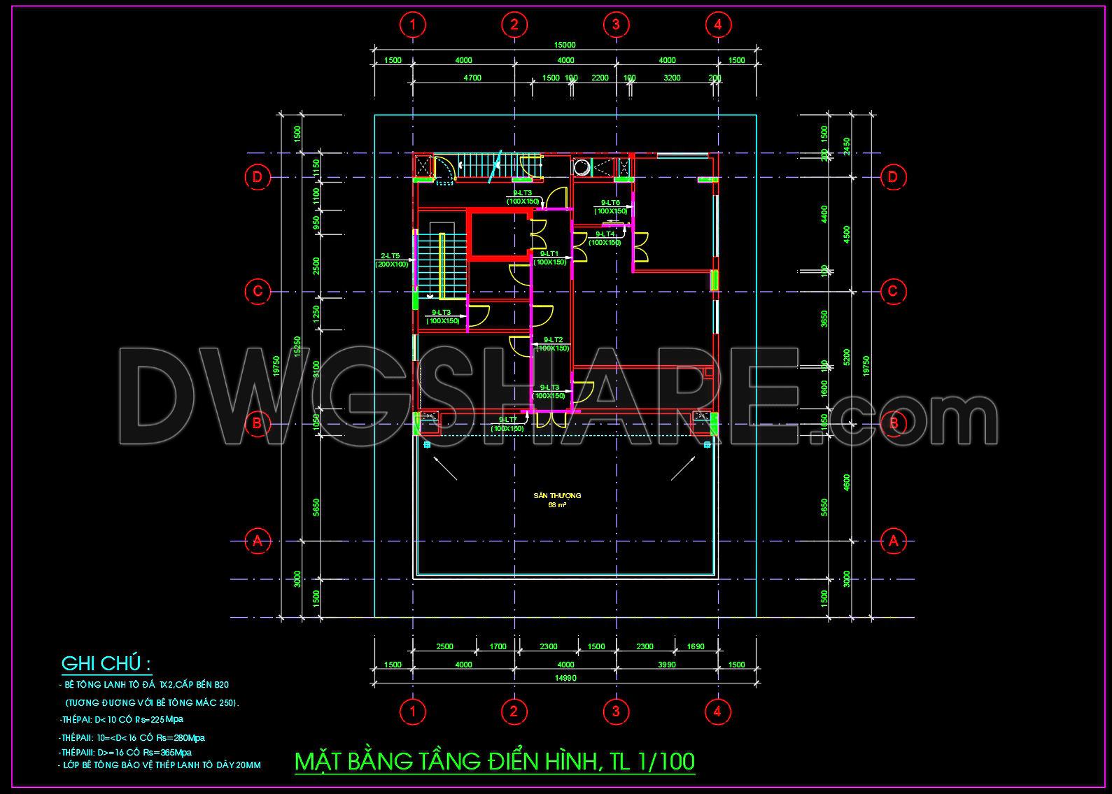 This CAD drawing illustrates the typical floor plan of a building at a 1/100 scale. The plan uses a grid system labeled A–D and 1–4 to define spatial organization, with detailed dimensions provided in millimeters. Rooms, doors, staircases, and the terrace are clearly arranged, with standardized symbols for windows and doors. The notes in the lower corner specify technical requirements, including concrete grade B20 (equivalent to M250), steel strength according to diameter, and a 20mm protective concrete layer for reinforcement. This document is an essential resource for architectural design, construction, and quality control.