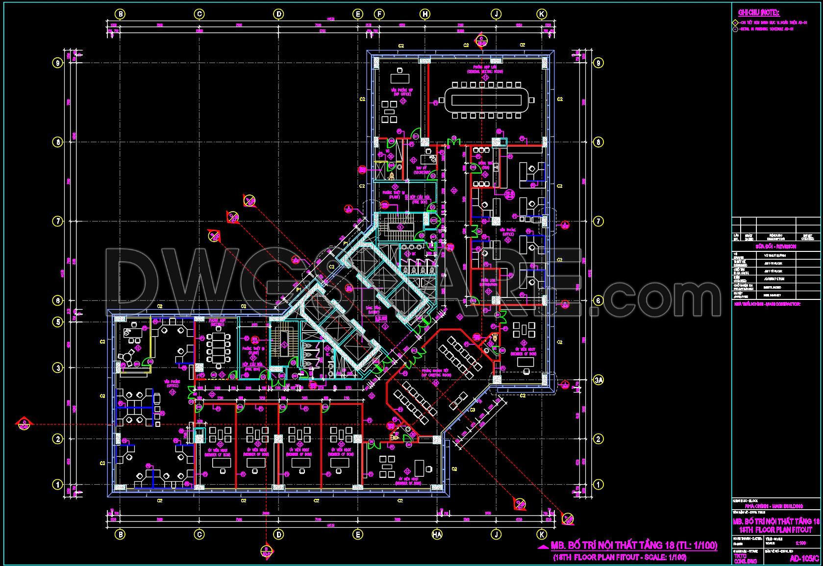 The drawing illustrates the interior layout plan of the 18th floor of Building office tower, at a scale of 1/100. It includes functional spaces such as offices, meeting rooms, reception areas, and corridors. The grid system A–K and 1–9 ensures precise positioning of each area. Colored symbols represent furniture, technical equipment, and finishing materials. On the right side, the notes section shows the project name, drawing code, and architect information. This drawing is provided as a free download for reference, supporting construction, supervision, and interior fit-out of high-rise office projects.