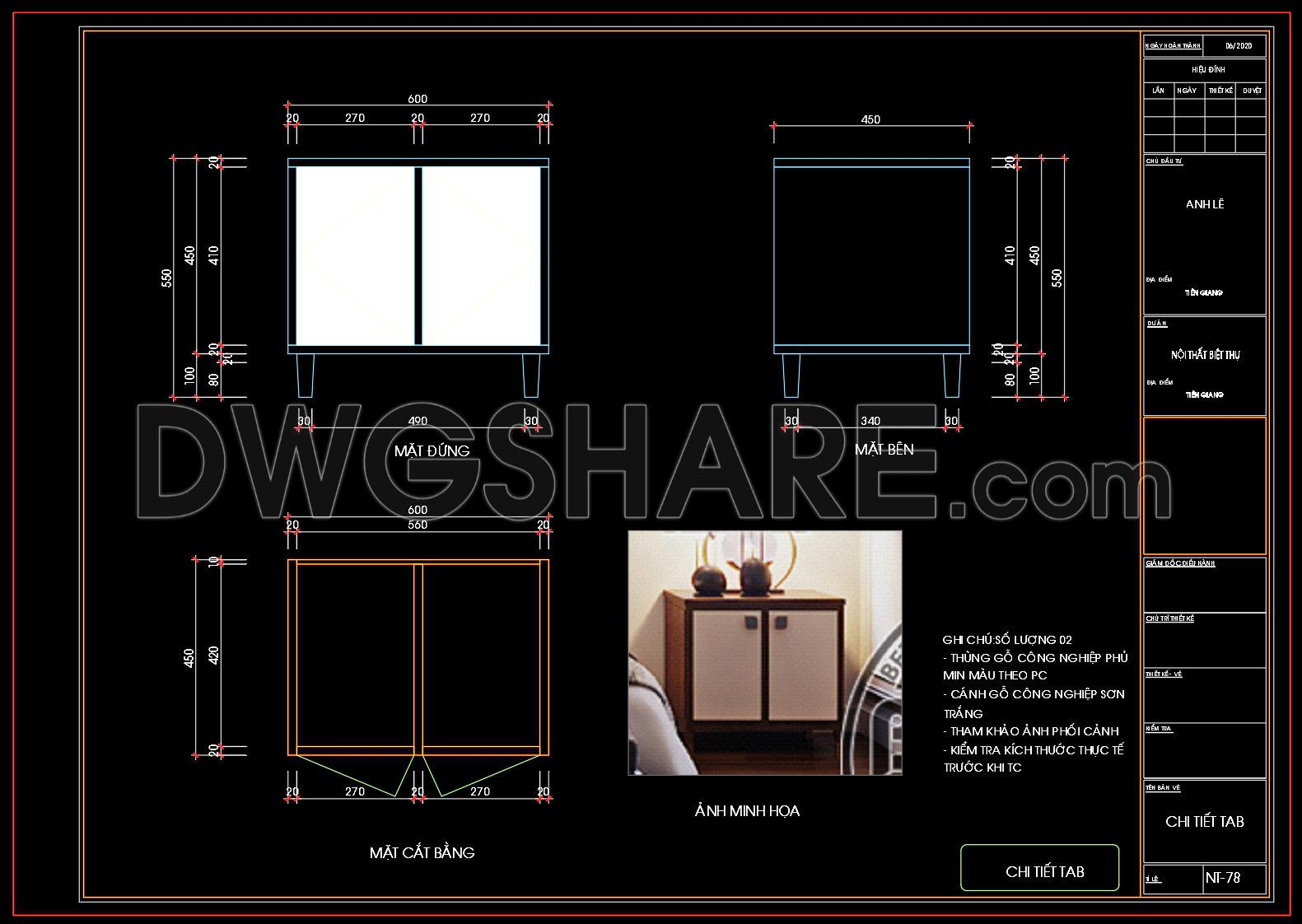 133. Free Download – CAD Shop Drawing of Bedside Table