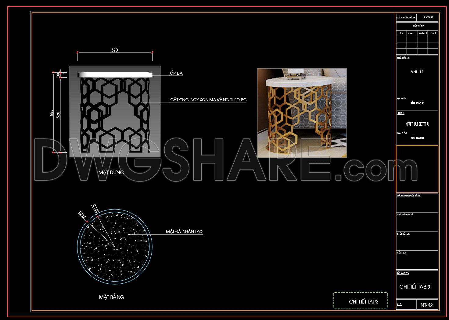 The CAD Shop Drawing of a Bedside Table offers a precise and detailed representation of this elegant furniture piece, showcasing its intricate design. As a furniture drawing, it provides multiple views and technical details essential for both design professionals and craftsmen. The drawing includes elevations that highlight the unique pattern cut from CNC-machined stainless steel, finished with a stunning gold coating. This exterior view helps in appreciating the artistic nuances that are crucial for aesthetic evaluation.