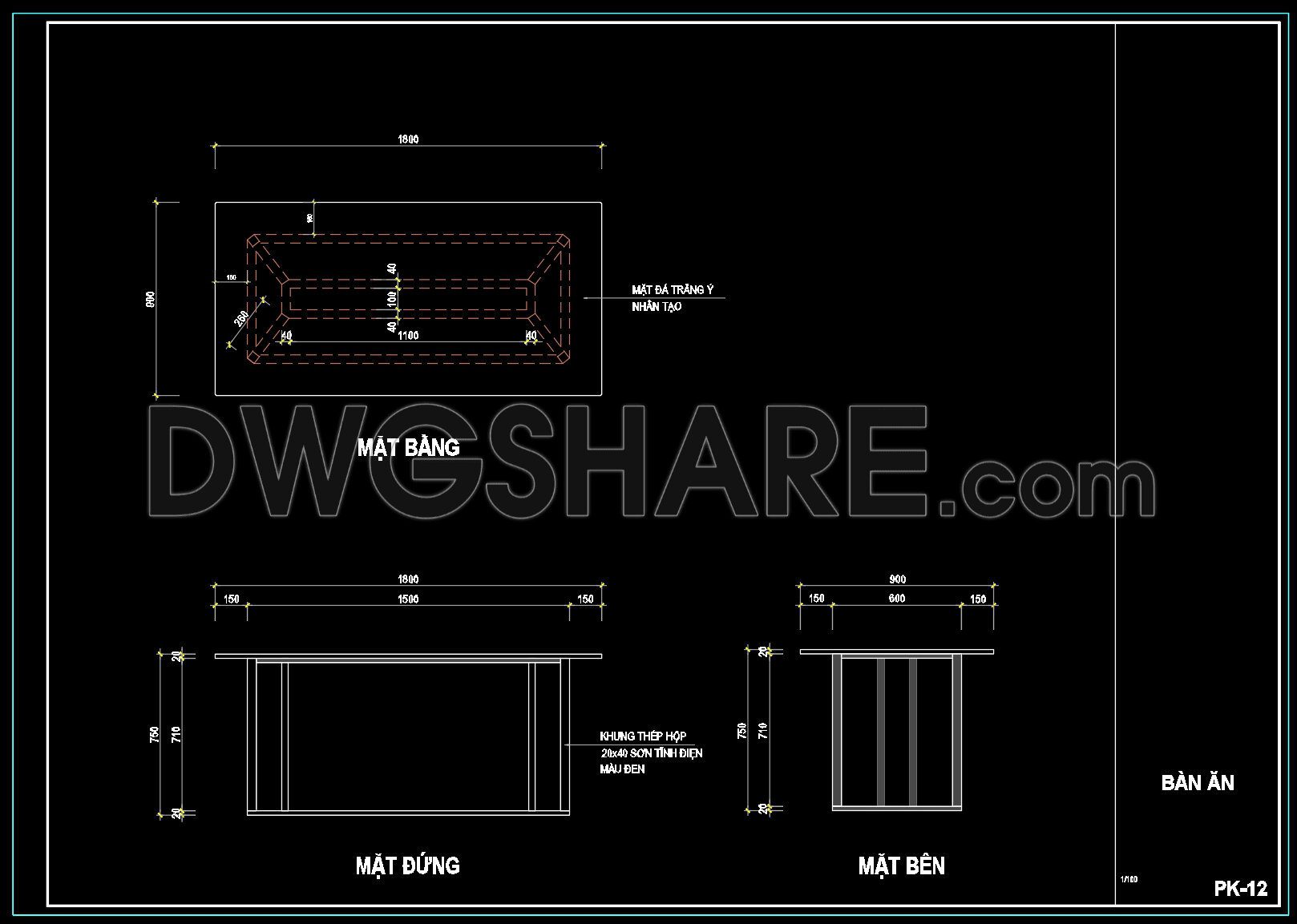 The CAD drawings for the modern dining table design presented here are a valuable resource for architects and designers. Featuring top, side, and front views, these drawings showcase the table’s sleek and functional structure. Key dimensions are explicitly provided, with the table measuring 1800mm in length, 900mm in width, and 750mm in height, making it ideal for contemporary dining spaces.