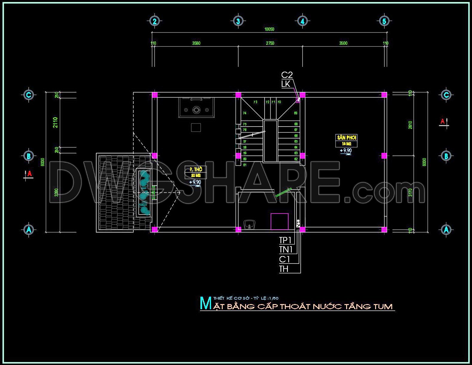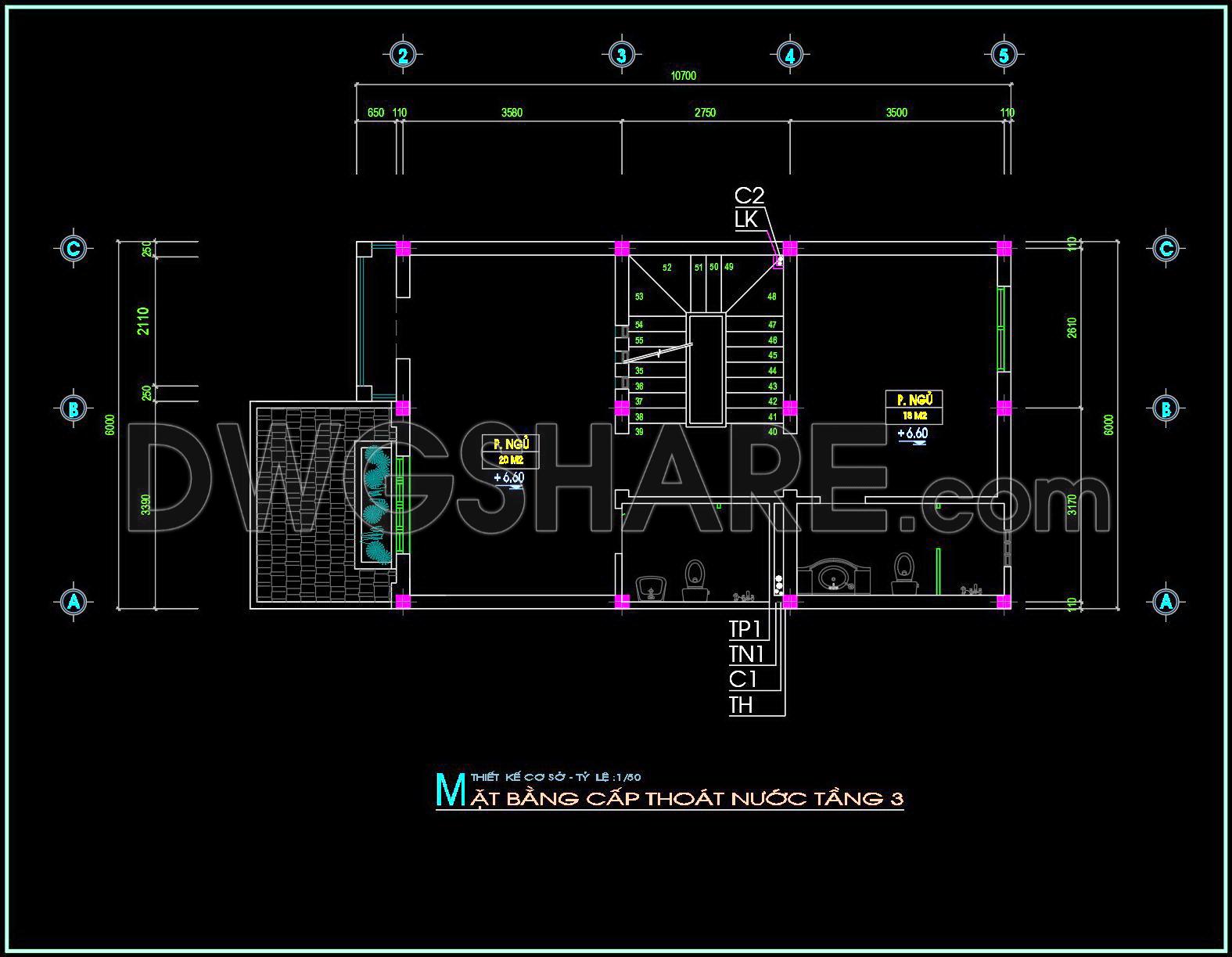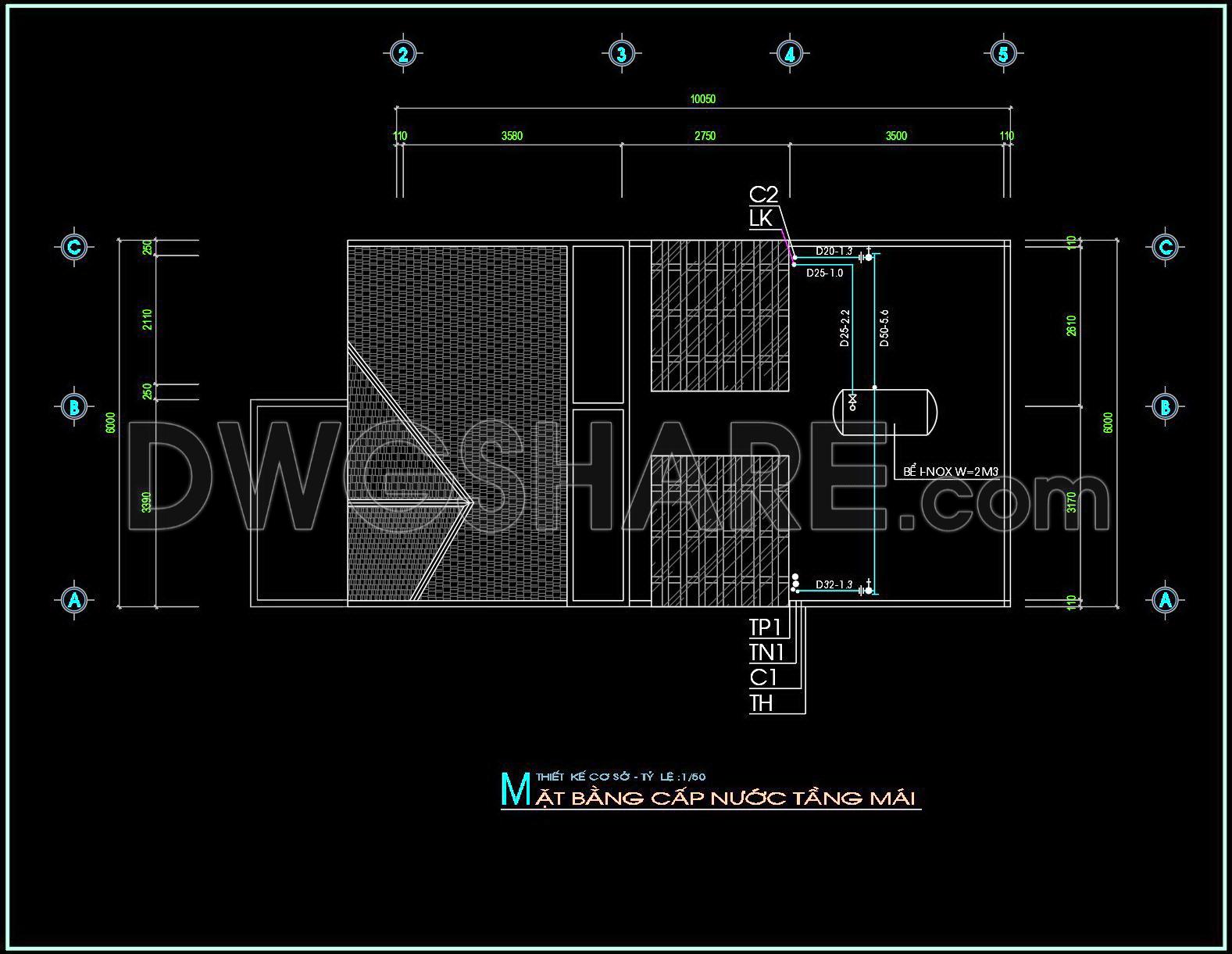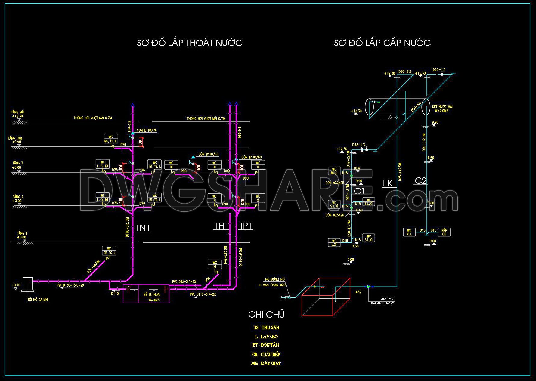 141. CAD drawings detailing the design of water supply and drainage systems for a 3-story townhouse