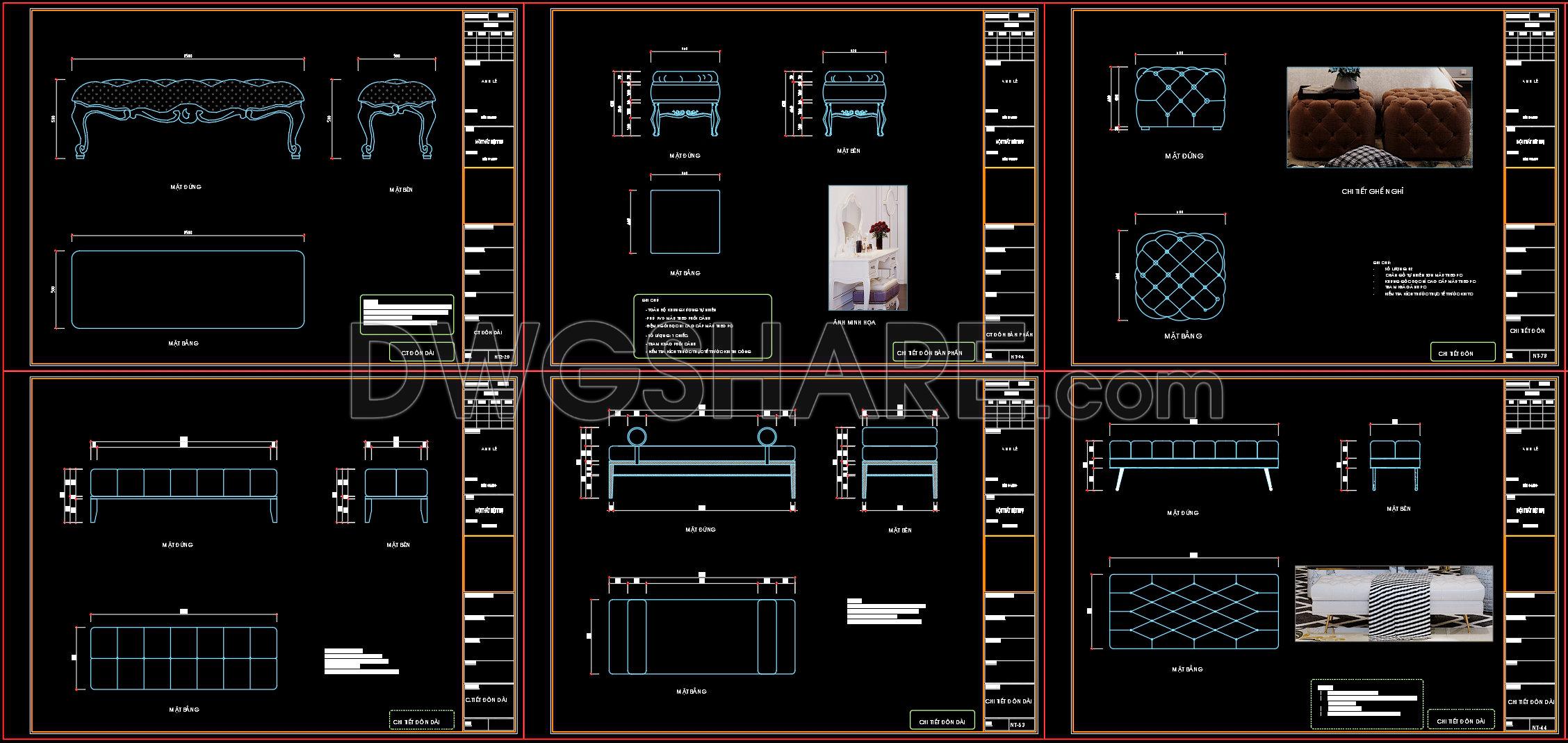 Overall, this CAD set serves as a valuable technical reference for bedroom benches, end-of-bed seating, dressing area furniture, and custom-made interior furnishings, helping streamline the design-to-production workflow.