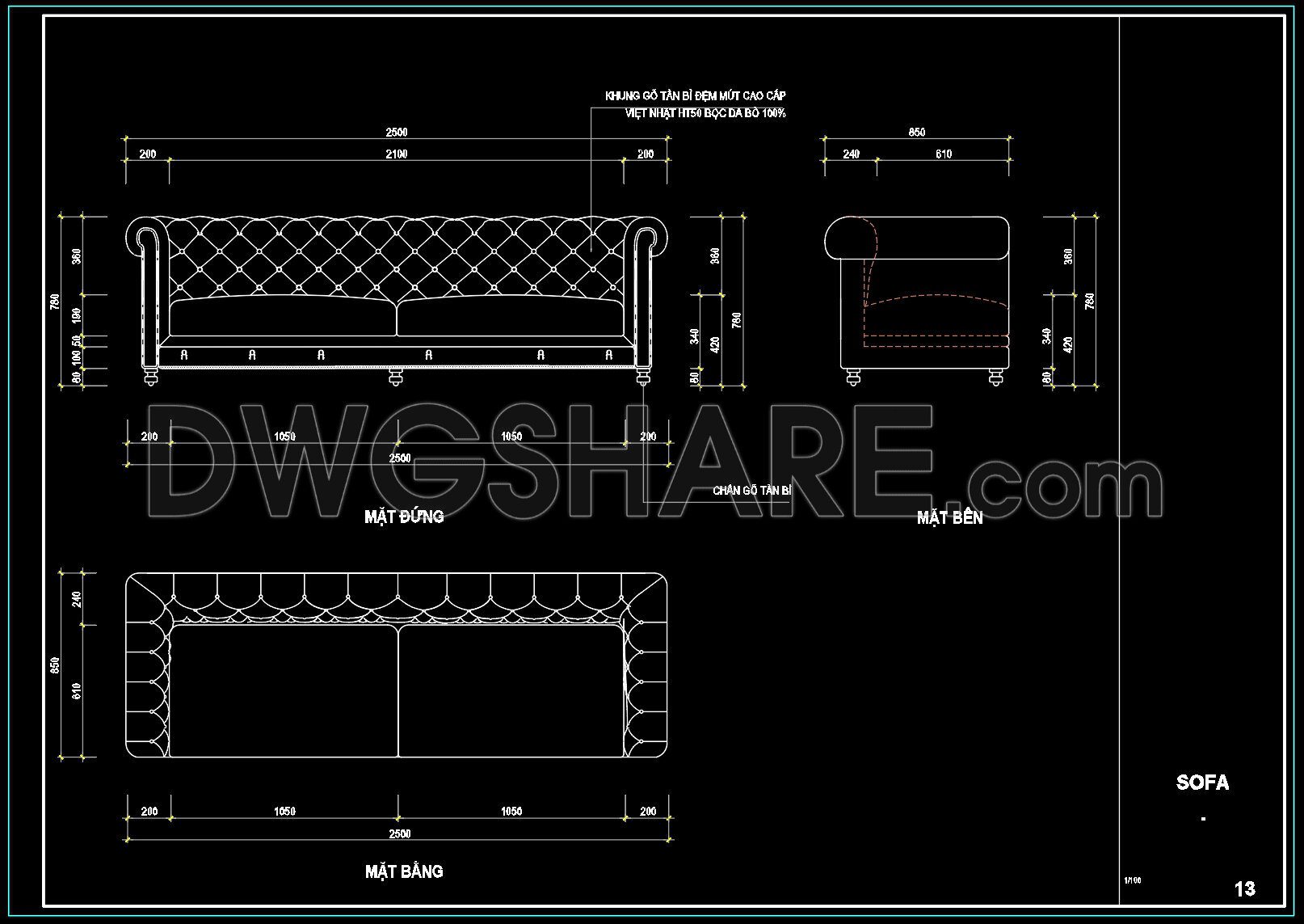 This set of CAD drawings showcases a classic-style sofa design with comprehensive detail. The primary subject is a sofa layout that includes: Front Elevation: Showcasing intricate quilting with overall dimensions of 2500mm (L) x 920mm (H). Side View: Highlighting rolled arms and wooden legs, dimensions 850mm (W) x 920mm (H). Top View: Detailing cushion layout and, again, a length of 2500mm. The structure features a high-quality wooden frame and foam cushioning upholstered in 100% leather. This file includes precise dimensional data for manufacturing and design accuracy, suited for creating elegant interiors. Professional Value: Ideal for interior designers, manufacturers, and builders, this drawing aids in construction planning, furniture manufacturing, and design references. Download now for precise schematics and effective project execution.