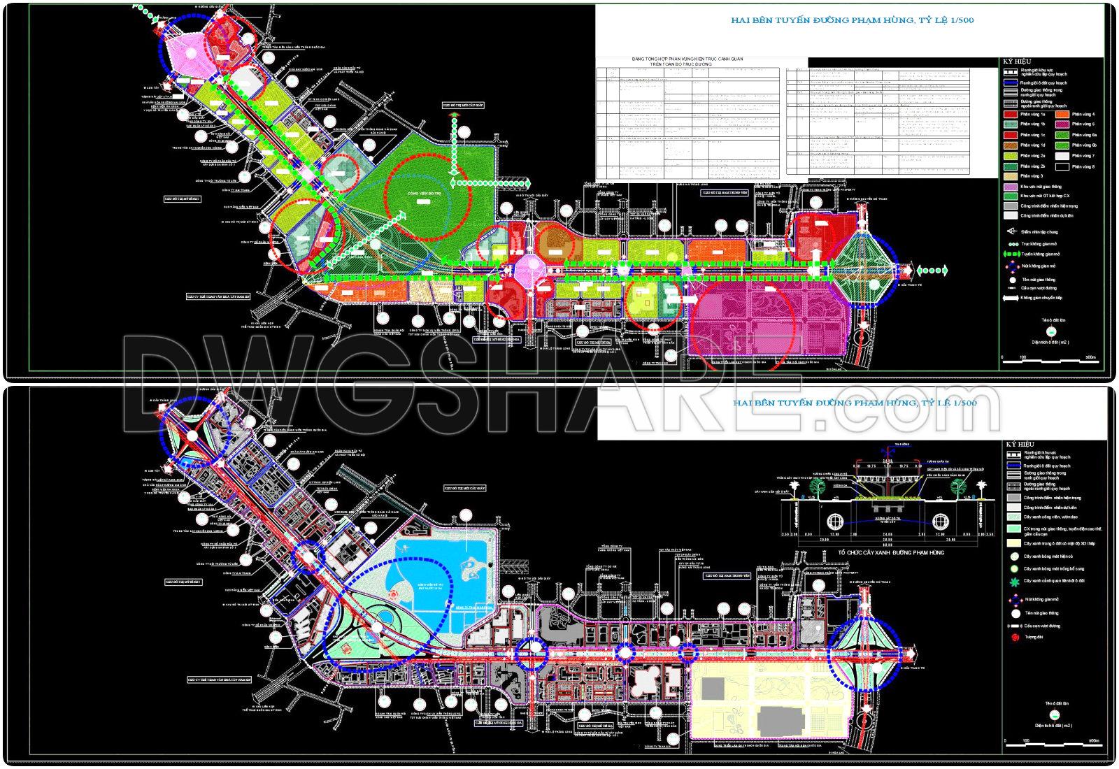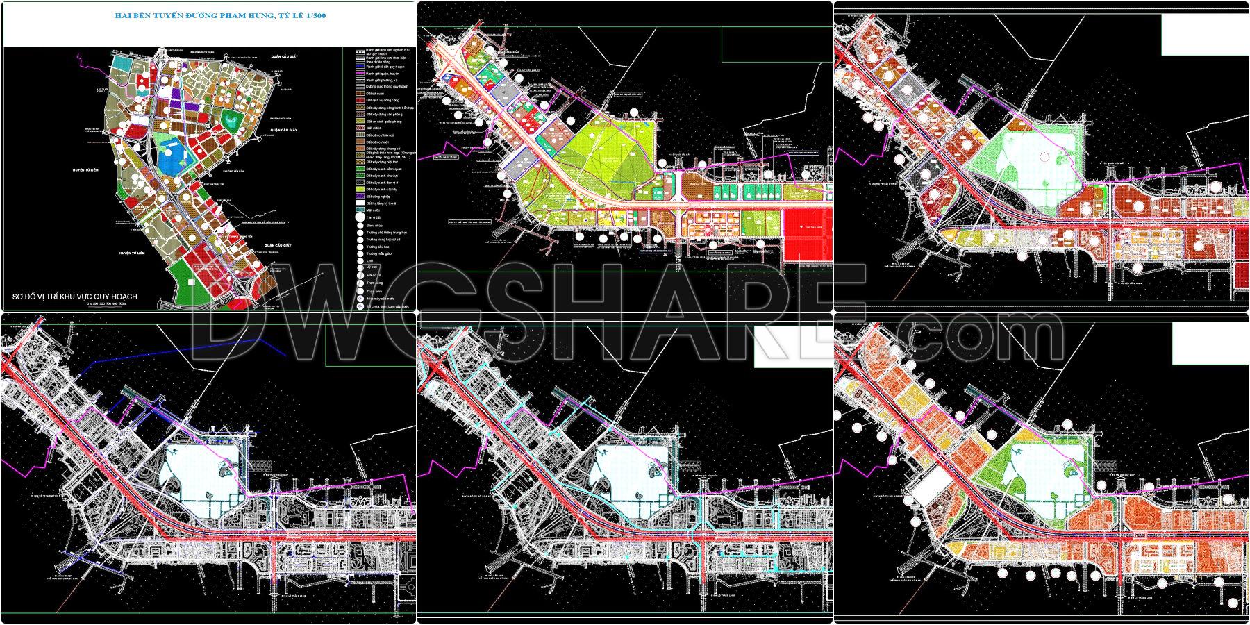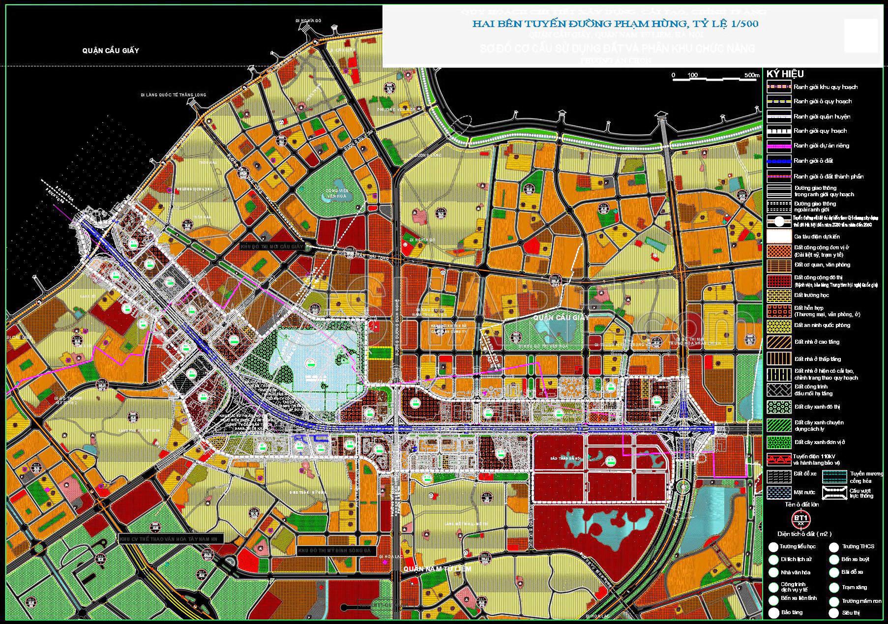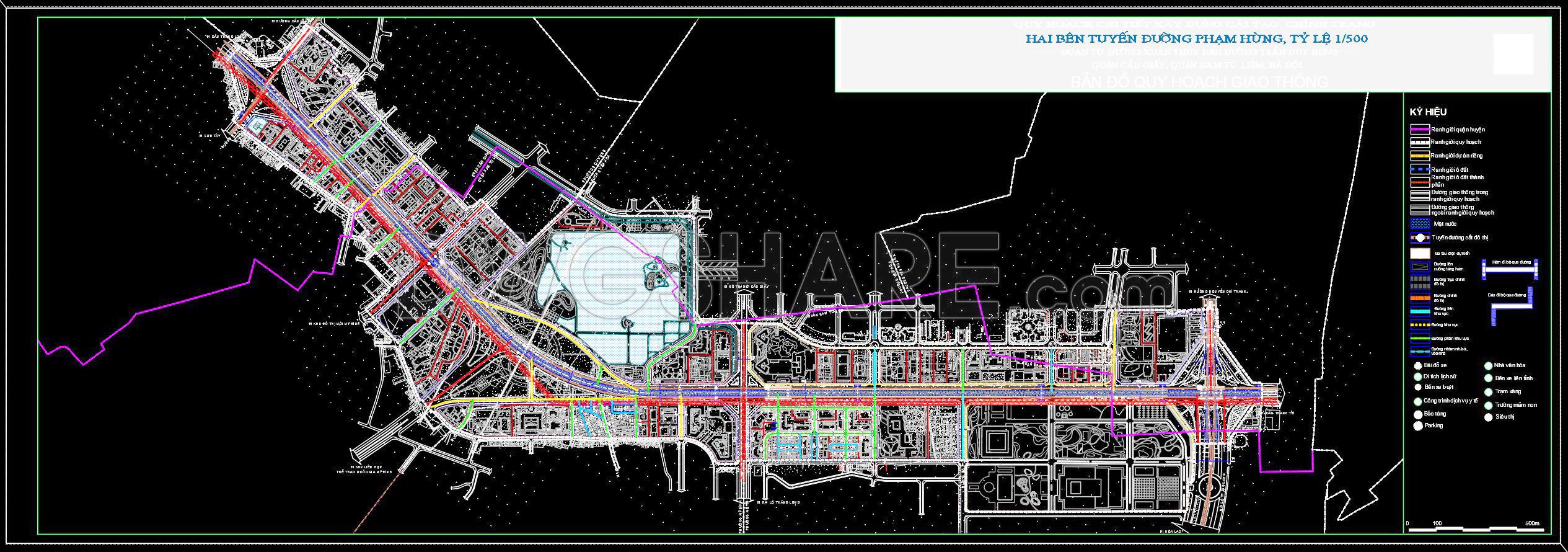 The CAD drawing illustrates the transportation planning on both sides of Pham Hung Road at a 1/500 scale. The map uses a detailed system of colors and symbols to define planning boundaries, land plots, and protection corridors for infrastructure such as electricity, water, drainage, and communication lines. Existing, planned, and proposed roads are clearly marked, along with traffic structures like roundabouts, underpasses, and overpasses. Additionally, the map displays routes for buses, subways, urban railways, and national railways.