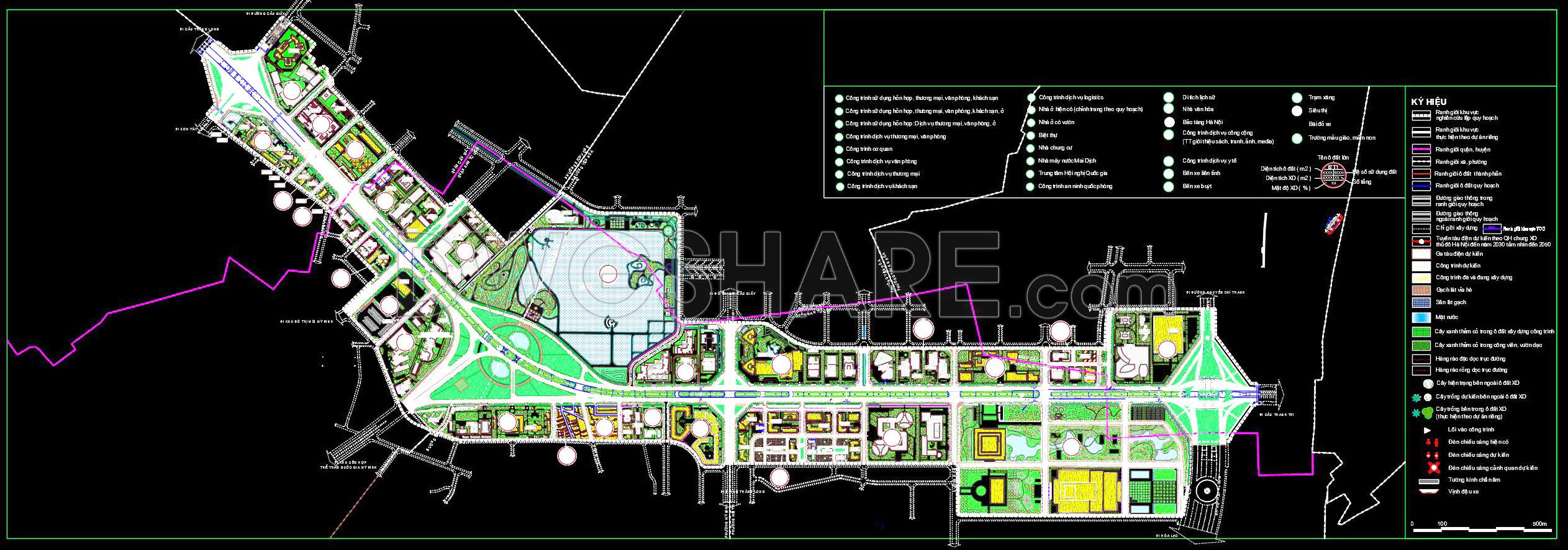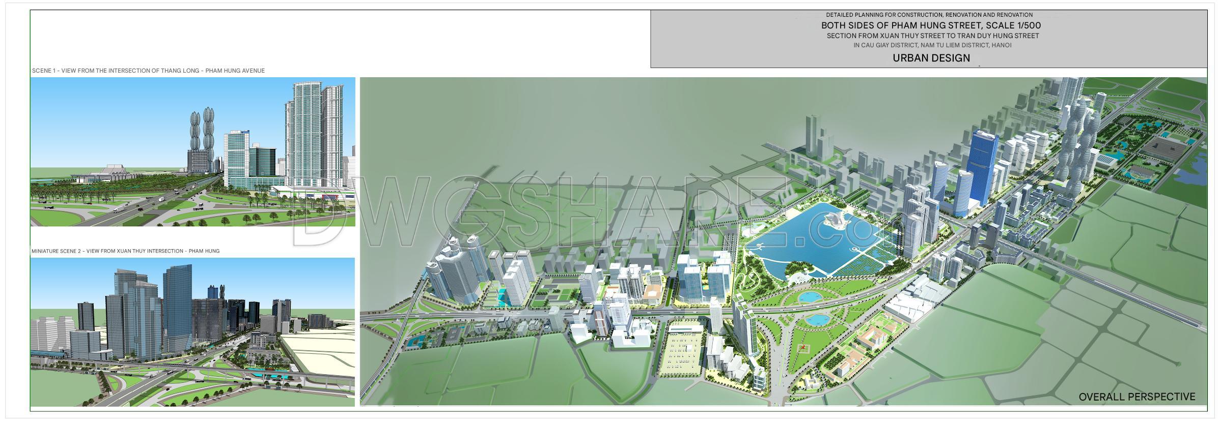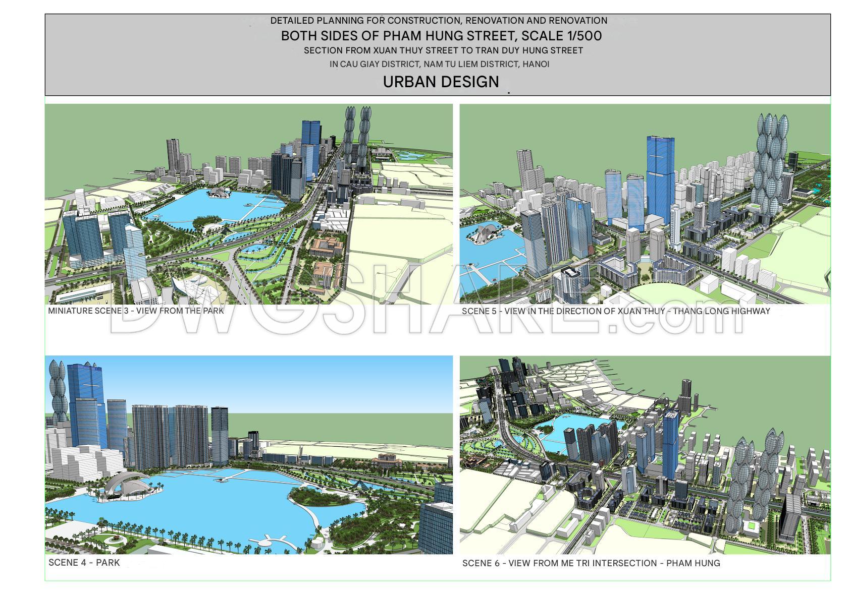 - 3D perspective drawings: Views from major intersections like Xuan Thuy, Me Tri, Thang Long – Pham Hung, showcasing a modern urban space
