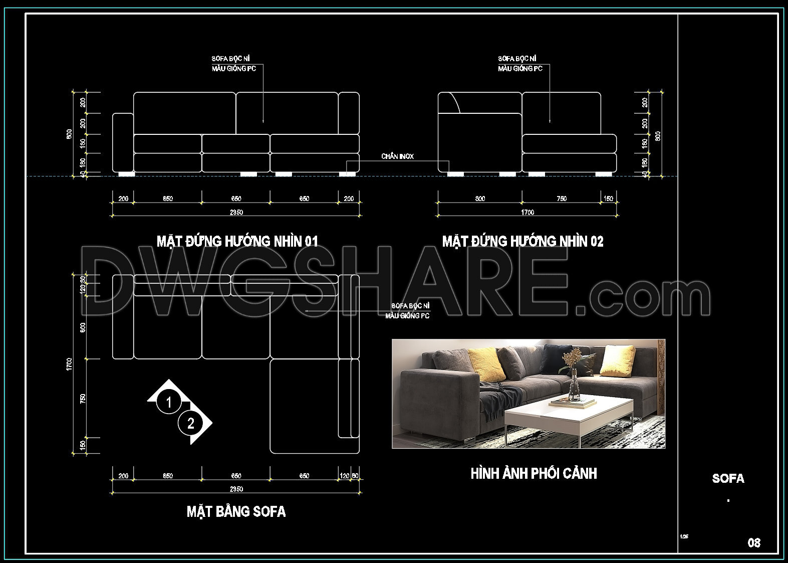 This collection of CAD drawings provides detailed plans for a modern sectional sofa. Key components include: Sofa Dimensions: Total length of 2350mm with a depth of 1750mm. Materials: Upholstered in fabric, designed for comfort and durability. Frame and Legs: Sturdy design with inox steel legs. Views Included: Plan View: Top-down layout showing overall dimensions and configuration. Elevation Views: Side and front profiles for detailed height and depth insights. 3D Rendering: Visual representation showcasing the sofa in a realistic setting. This set is of great professional value for interior designers, architects, and furniture manufacturers, facilitating effective planning and execution in both residential and commercial projects. Download now to enhance your design and planning toolkit.
