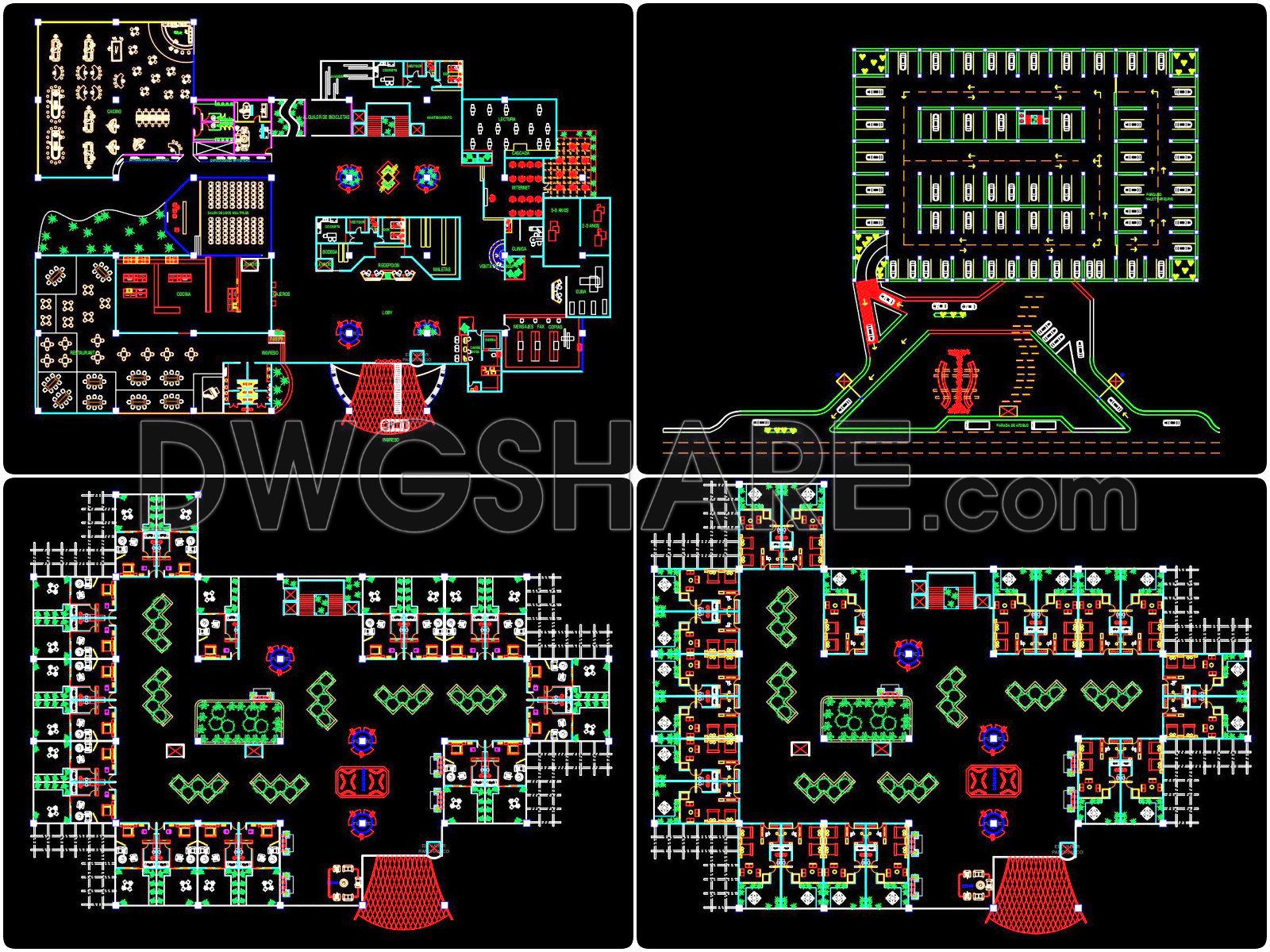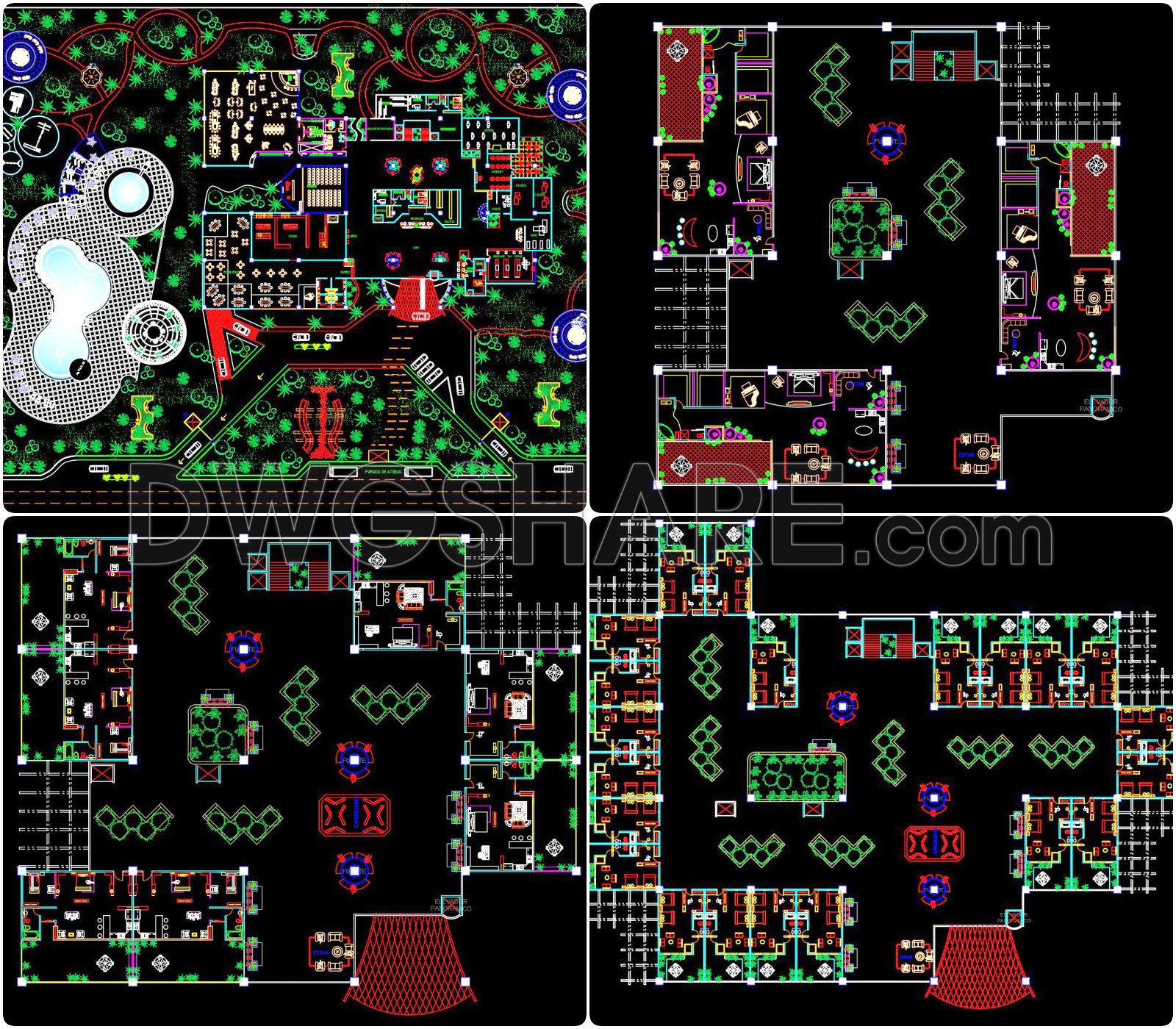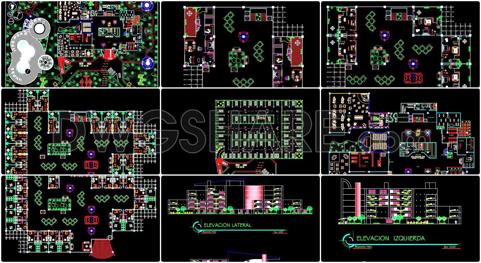 Discover the comprehensive set of architectural drawings for a 5-storey hotel, meticulously detailed to support various stages of design and construction. This suite of CAD DWG files offers an extensive overview of the building’s design through architectural floor plans, elevations, and sections. Each element is crafted with precision, ready to be deployed for analysis, design development, or as a reference in various architectural projects.