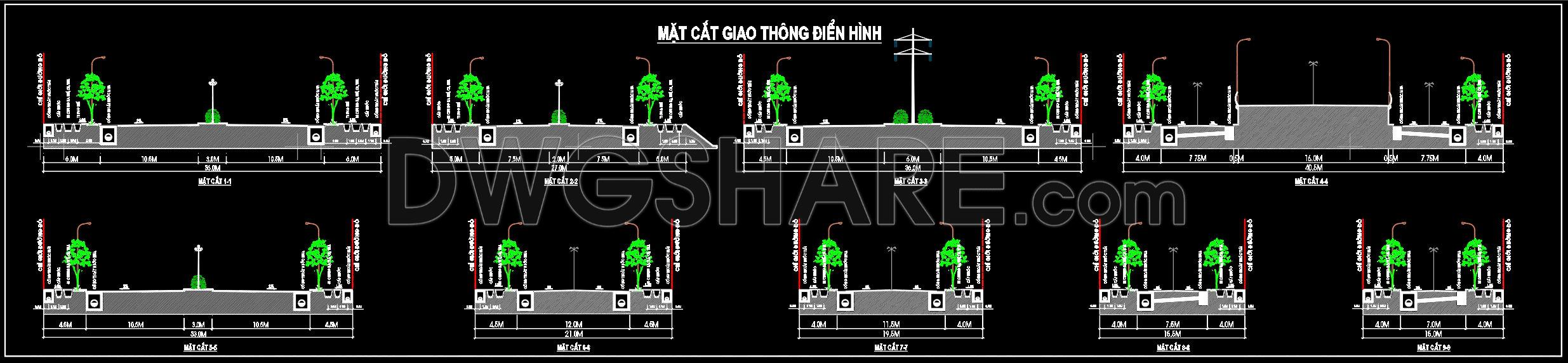 The transportation system is designed in a flexible grid network, ensuring seamless connectivity between functional zones. At the top of the drawing, typical cross-sections are detailed with diverse road widths, incorporating wide sidewalks, greenery, and urban lighting systems.