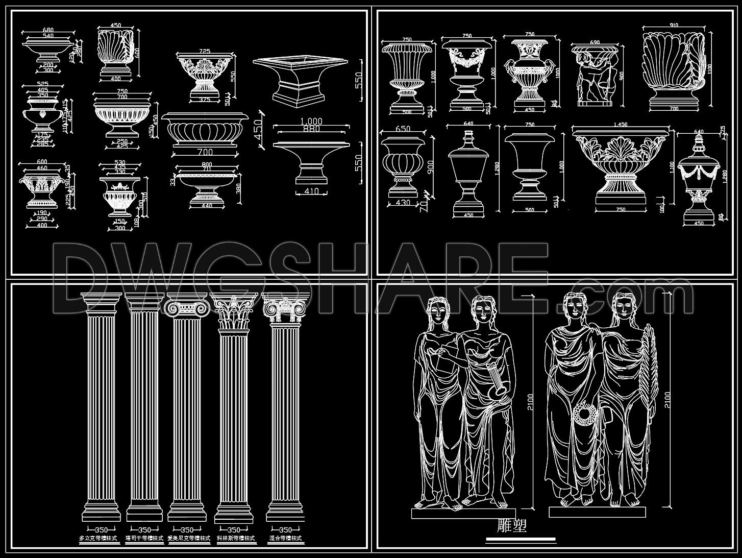 The drawing set comprises three main components: columns, sculptures, and decorative planters. Each element is detailed with optimal precision to ensure it meets the diverse needs of architectural design and construction.