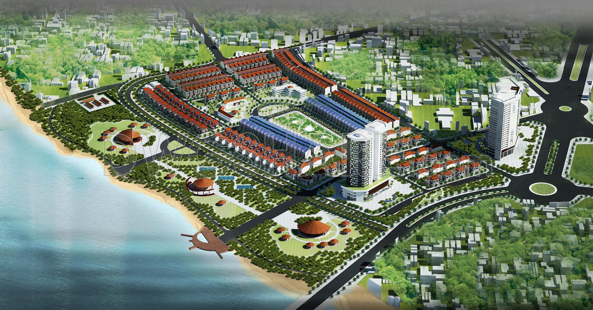 The transportation network is clearly defined with main arterial roads, internal streets, roundabouts, and pedestrian connections, ensuring efficient circulation and accessibility throughout the site. Landscape design plays a central role, featuring riverside parks, green buffers, recreational areas, and visual corridors toward the water. The 3D rendered perspectives provide an overall view of the spatial organization, architectural form, and harmony between built-up areas and natural elements.