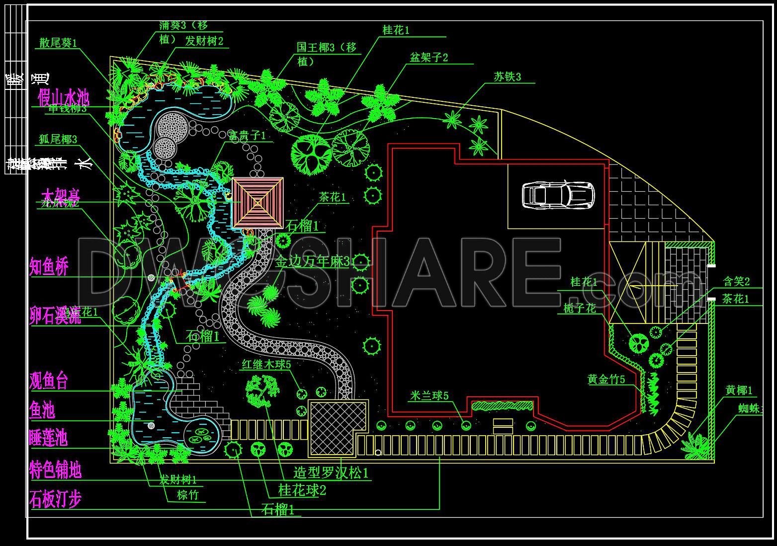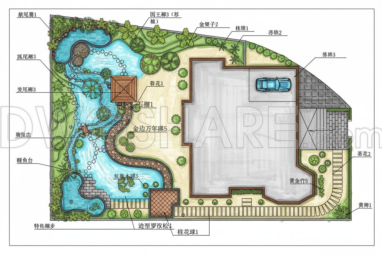 The Free Villa Courtyard Landscape CAD Drawings offer an insightful glimpse into the artful design of exterior spaces, demonstrating a harmonious blend of function and aesthetic appeal. These landscape design CAD drawings present a meticulously planned layout, showcasing both creativity and practicality. At the forefront, the functional floor plan layout is apparent, highlighting various elements like pathways, water features, and seating arrangements, which are integral to creating a serene courtyard environment.
