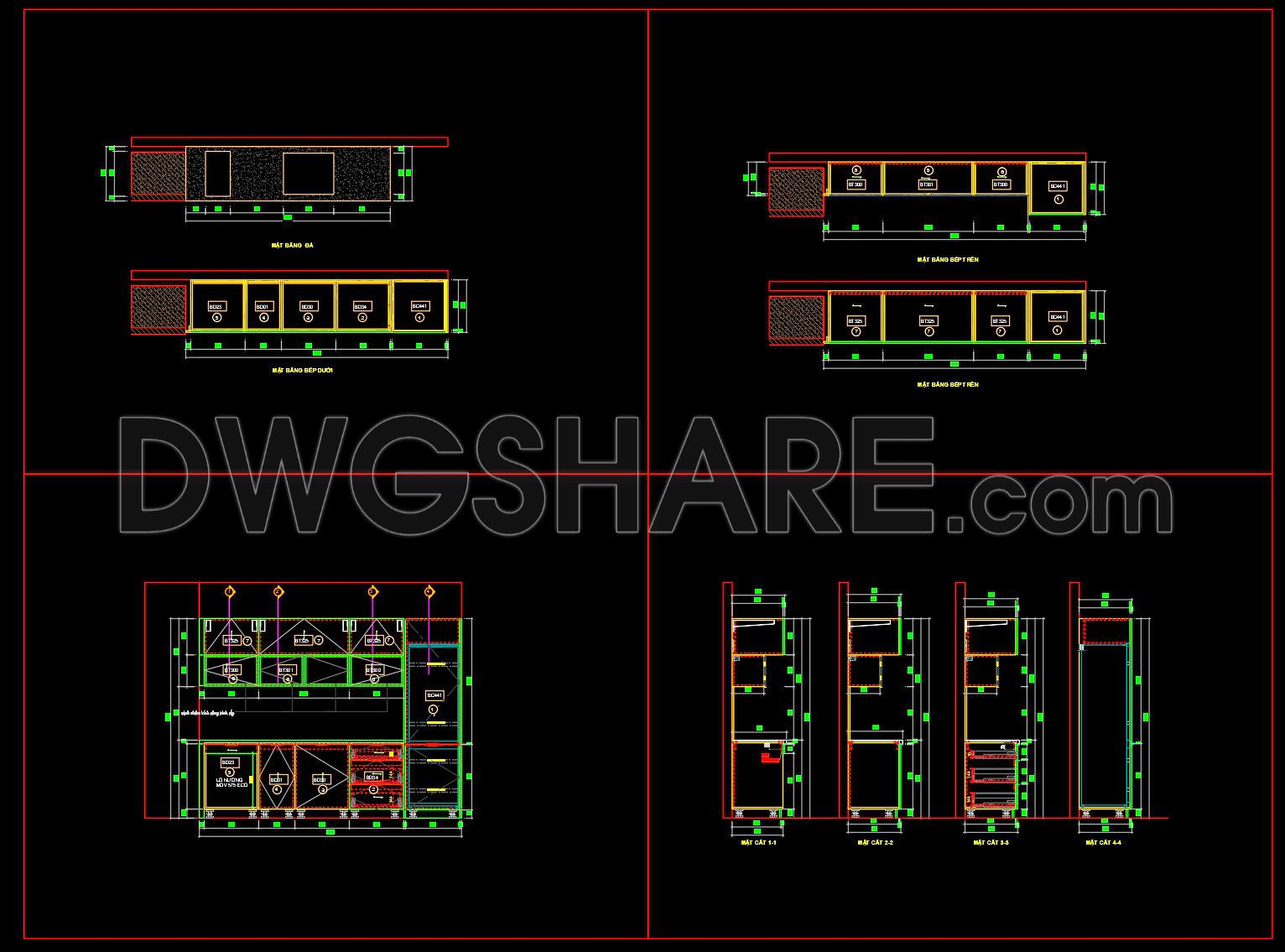 The provided CAD technical drawings of kitchen cabinets present a comprehensive view of cabinetry design, vital for architects, interior designers, and construction professionals. This set includes various drawing types essential for a thorough understanding and accurate construction of kitchen cabinet installations.