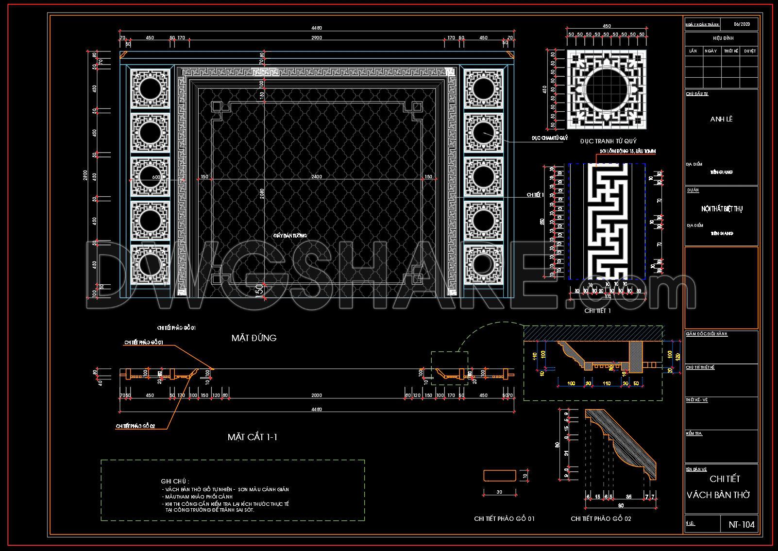 Bản vẽ CAD này thể hiện chi tiết thiết kế vách bàn thờ trong không gian nội thất mang phong cách truyền thống Việt Nam. Nội dung bản vẽ bao gồm nhiều hình chiếu và chi tiết cấu tạo, giúp người thi công và thiết kế dễ dàng hình dung và triển khai thực tế.