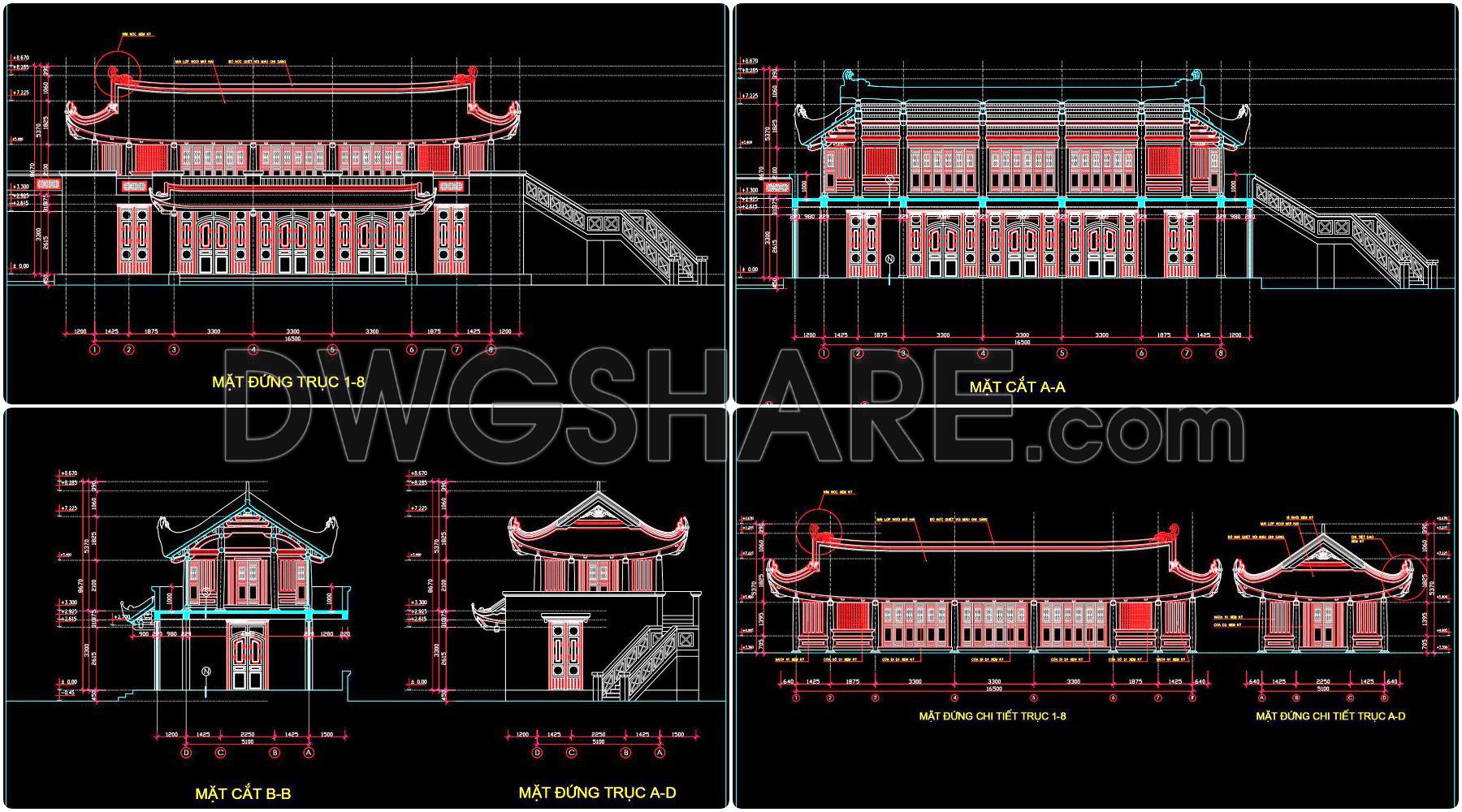 One of the most noticeable elements is the roof structure. The curved roof with upward-sweeping edges creates a silhouette often seen in traditional northern Vietnamese temples and communal houses. These graceful curves are not only decorative but also help give the building a lighter and more elegant appearance, especially when viewed from the main façade. In the detailed drawings, components such as roof frames, beams, wooden balusters, and ornamental elements are carefully illustrated, suggesting that the project pays close attention to traditional craftsmanship.