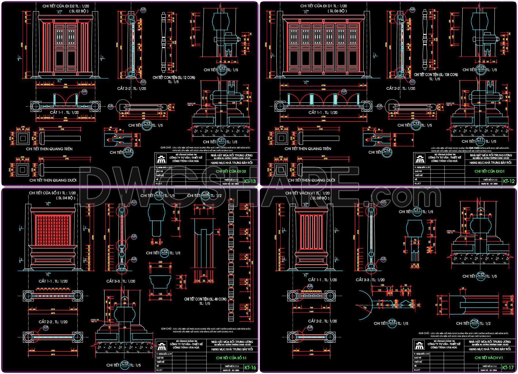 Another highlight of this drawing set is the collection of architectural details. Elements such as doors, columns, column bases, decorative roof edges, and wooden carvings are all carefully documented. While small in scale, these details play an important role in defining the architectural character of the project.
