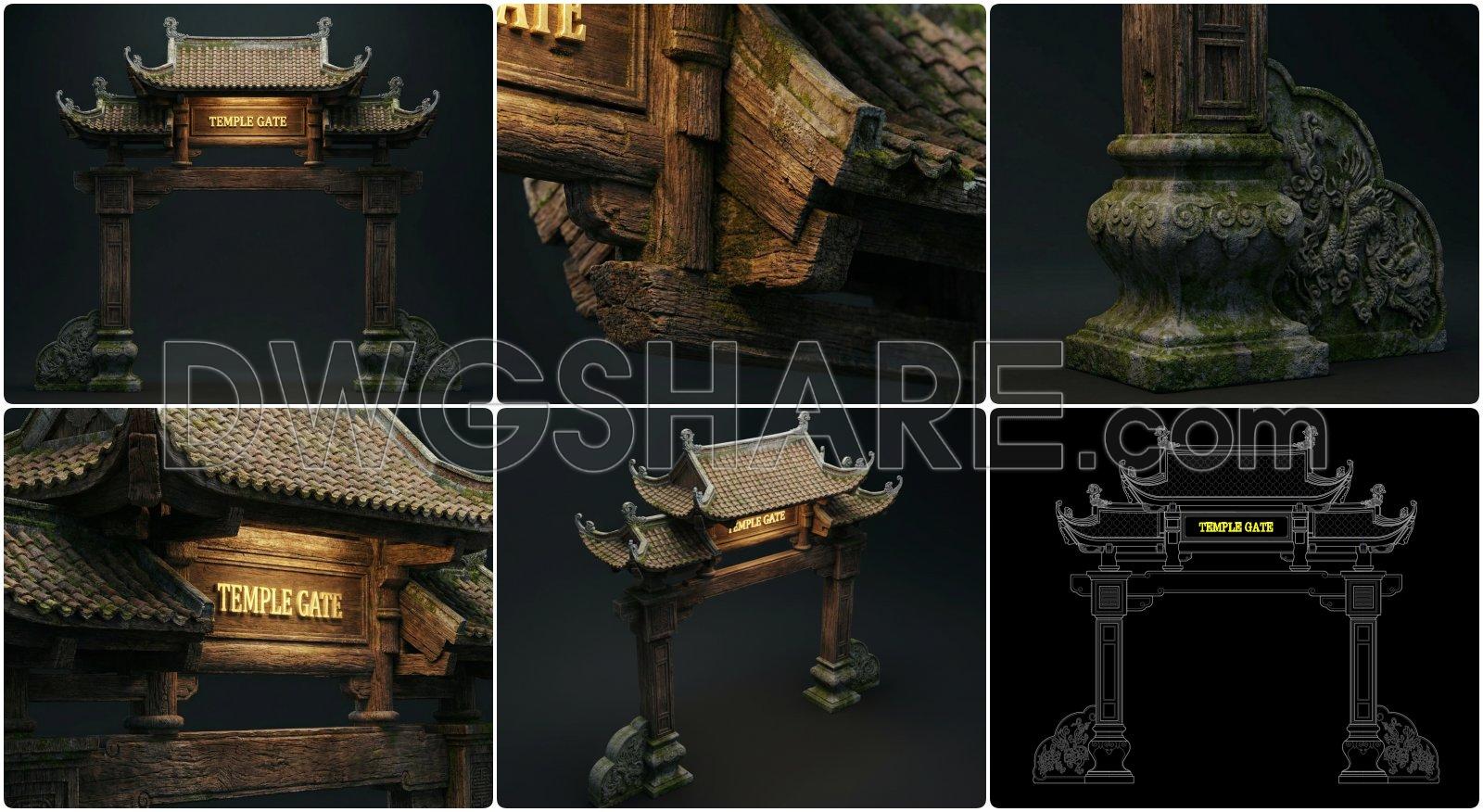 Elevations and Sections: The elevations provide a clear vertical representation of the temple gate, capturing intricate design details, including ornamental motifs and structural elements such as columns and roof shapes. The sections further dissect the gate architecture, offering insights into internal structures and the interplay of different components. These sections are vital for architects and engineers aiming to understand or recreate the aesthetic and structural necessities that traditional temple gates demand.