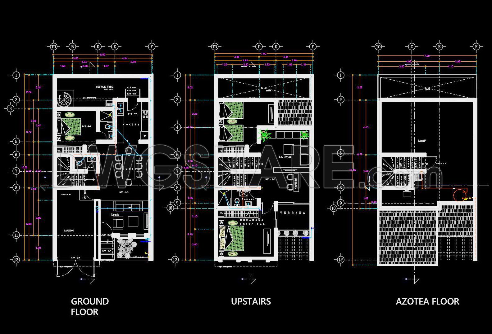 This architectural floor plan CAD drawing for a 2-story house, measuring 8m x 15m, provides a comprehensive look at a residential design optimized for functionality and efficiency. The detailed floor plans, featuring the ground floor, upstairs, and azotea floor, are essential for architects and construction professionals, offering both a structured approach to design and practical guidelines for building.