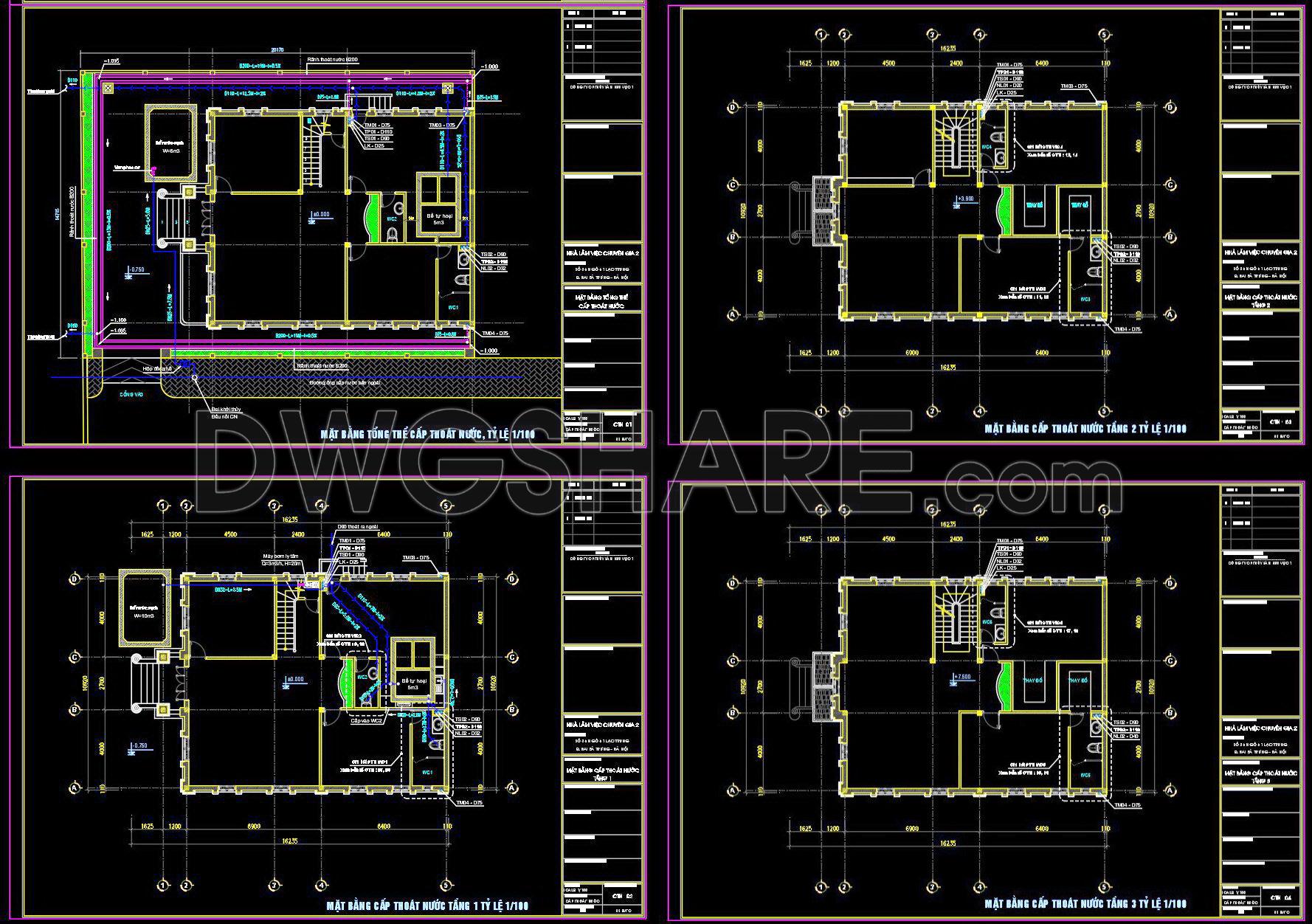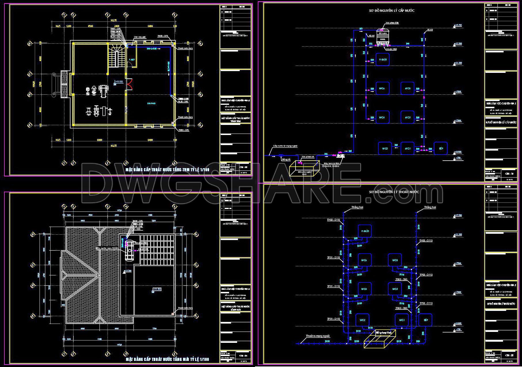 314. CAD drawings detailing the design of water supply and drainage systems for a 4-story townhouse
