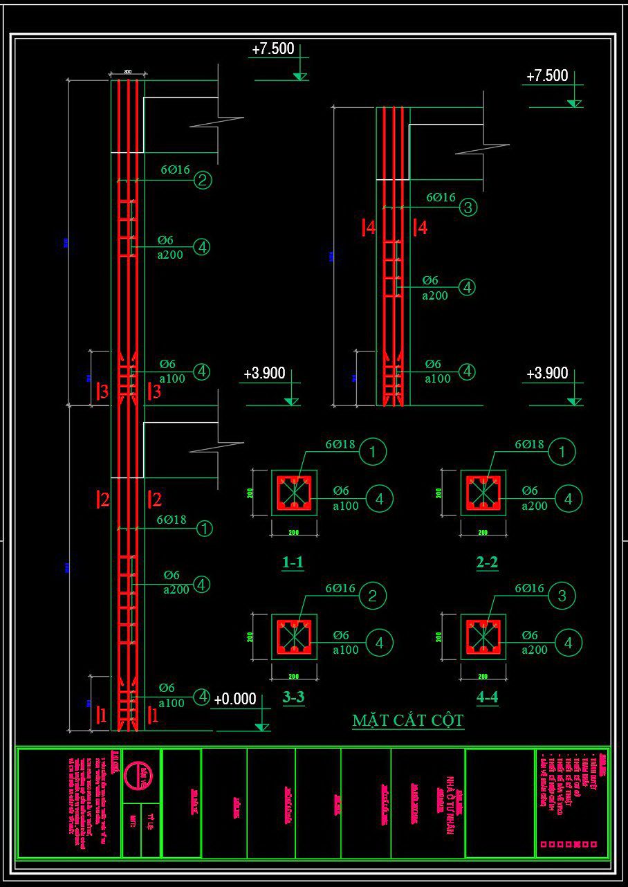 - Frame: Column layout plan and detailed column sections, indicating dimensions, floor elevations, and details of longitudinal and transverse reinforcement. Beam section drawings show detailed reinforcement layouts for main and shear reinforcement for various beam types.