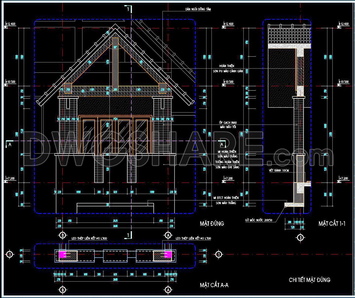 The entire drawing is presented with complete dimensions and technical annotations (in Vietnamese), helping the reader easily understand the architectural structure, materials used, and finishing methods of the pitched roof facade and the house exterior. This is a useful document for architects, engineers, and contractors. This drawing is available for free download.