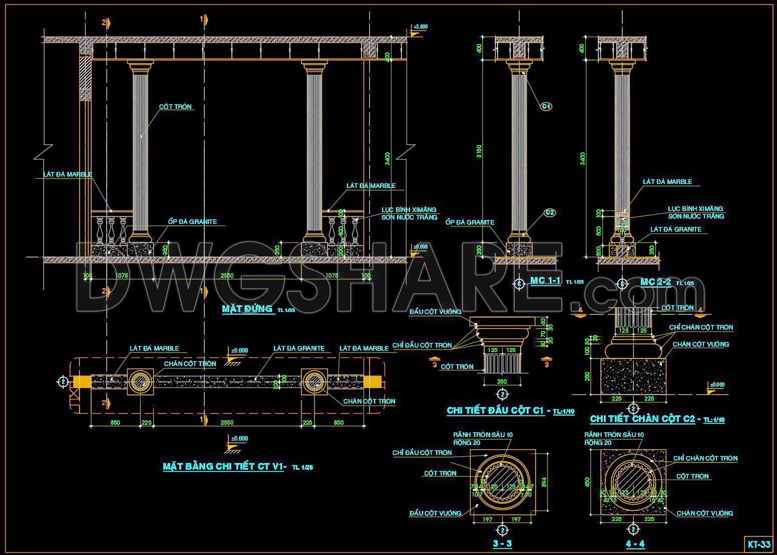 Separately, drawing KT-33 meticulously details a classical-style portico or colonnade featuring round columns. This sheet includes overall elevations, plans, sections through columns and foundations, and enlarged details (1:10 scale) of column capitals and bases. Specified materials include marble cladding, granite cladding, and white-painted cement balusters. Overall, this is a comprehensive set of detailed drawings, invaluable for the construction of exterior architectural features, and is offered as a free download to assist with your projects.