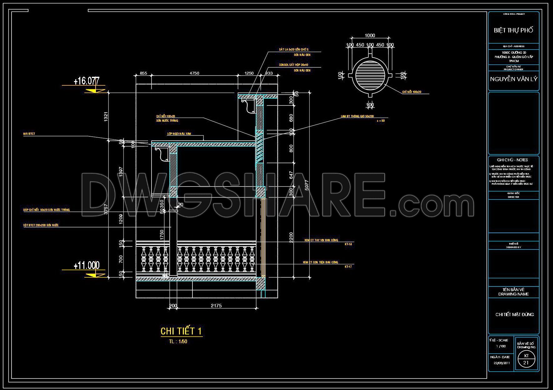 This is a set of detailed CAD drawings for a part of a townhouse’s architecture, including various sections and elevations at different levels, focusing on column, door, railing, and balcony handrail details.
