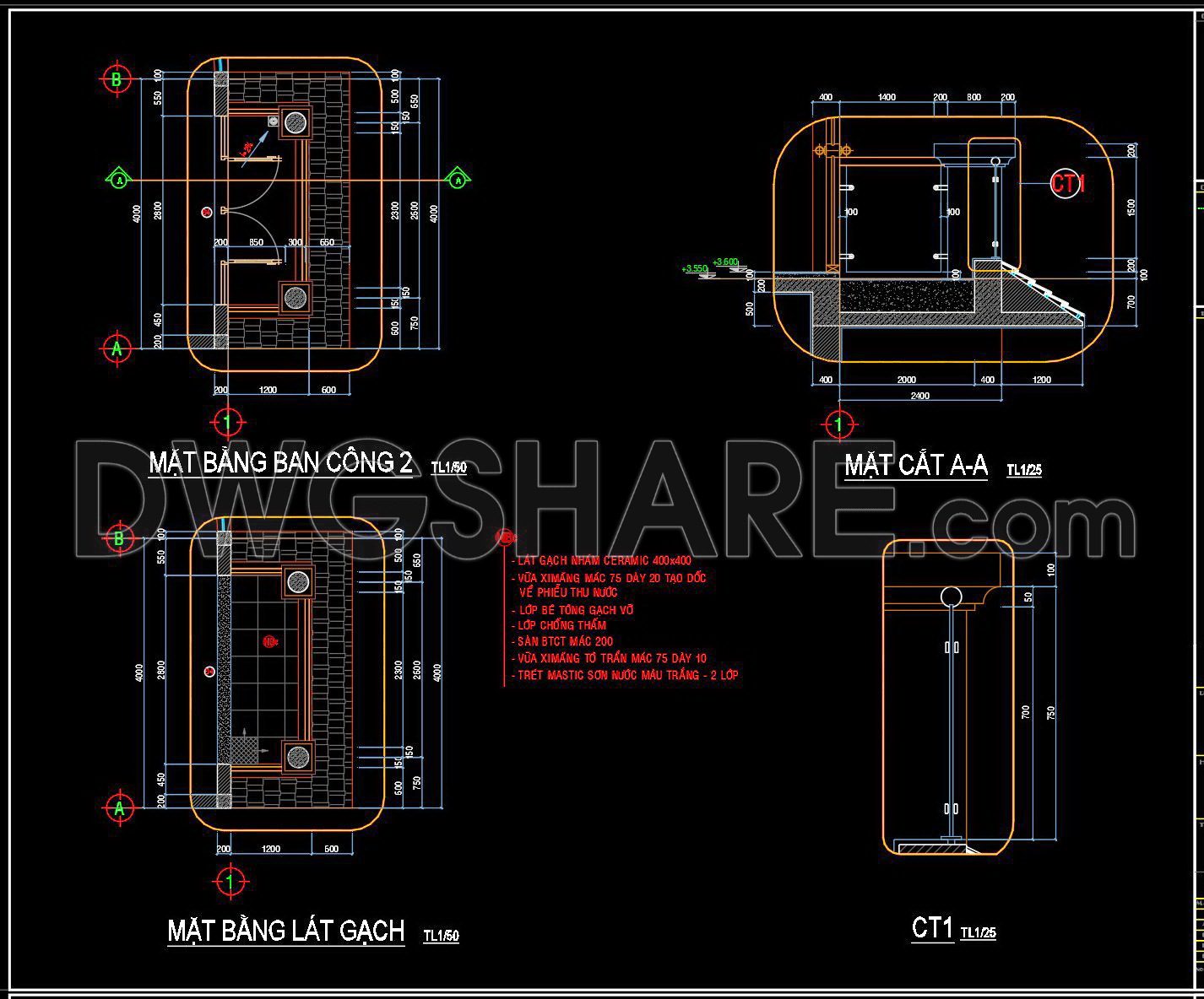 - MẶT CẮT A-A (SECTION A-A – Scale 1:25): Details the floor structure, comprising a 400x400mm ceramic tile layer, a sloping mortar layer, a crushed brick concrete layer, a waterproofing layer, a leveling mortar layer, and two layers of white mastic paint. The railing height is approximately 1000mm.