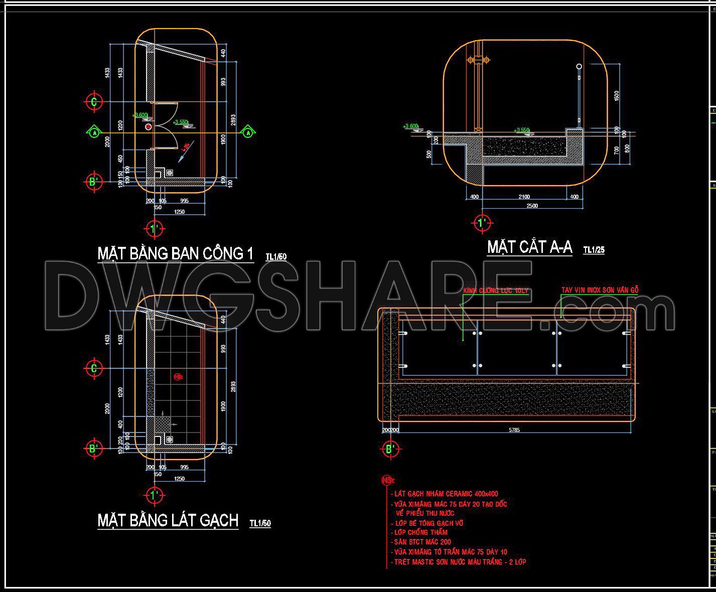 - MẶT CẮT A-A (SECTION A-A – Scale 1:25): The floor structure details are similar to Balcony 2, but the railing uses 10mm tempered glass and a wood-grain painted stainless steel handrail, with a railing height of approximately 1000mm.