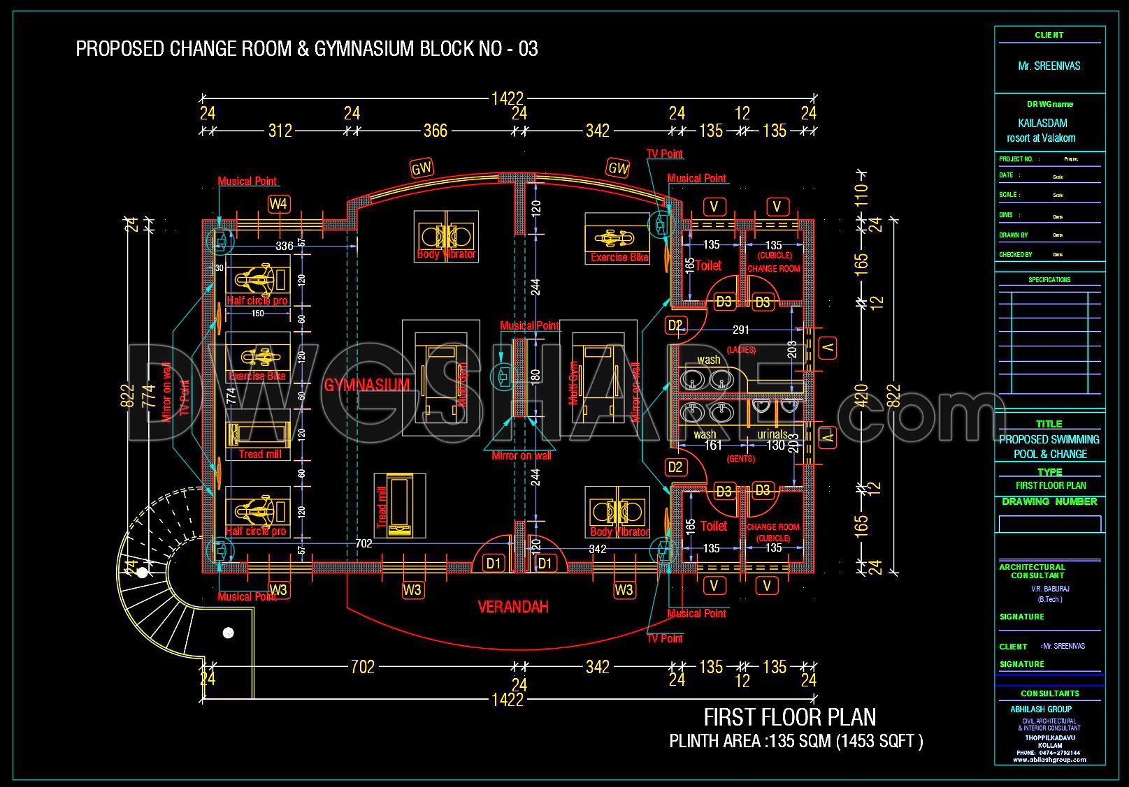 Explore the versatility of these CAD drawings for the proposed construction of a swimming pool, changing rooms, and gymnasium. The comprehensive designs include multiple views, ensuring a detailed understanding of the project layout. Key components illustrated in these blueprints cover: