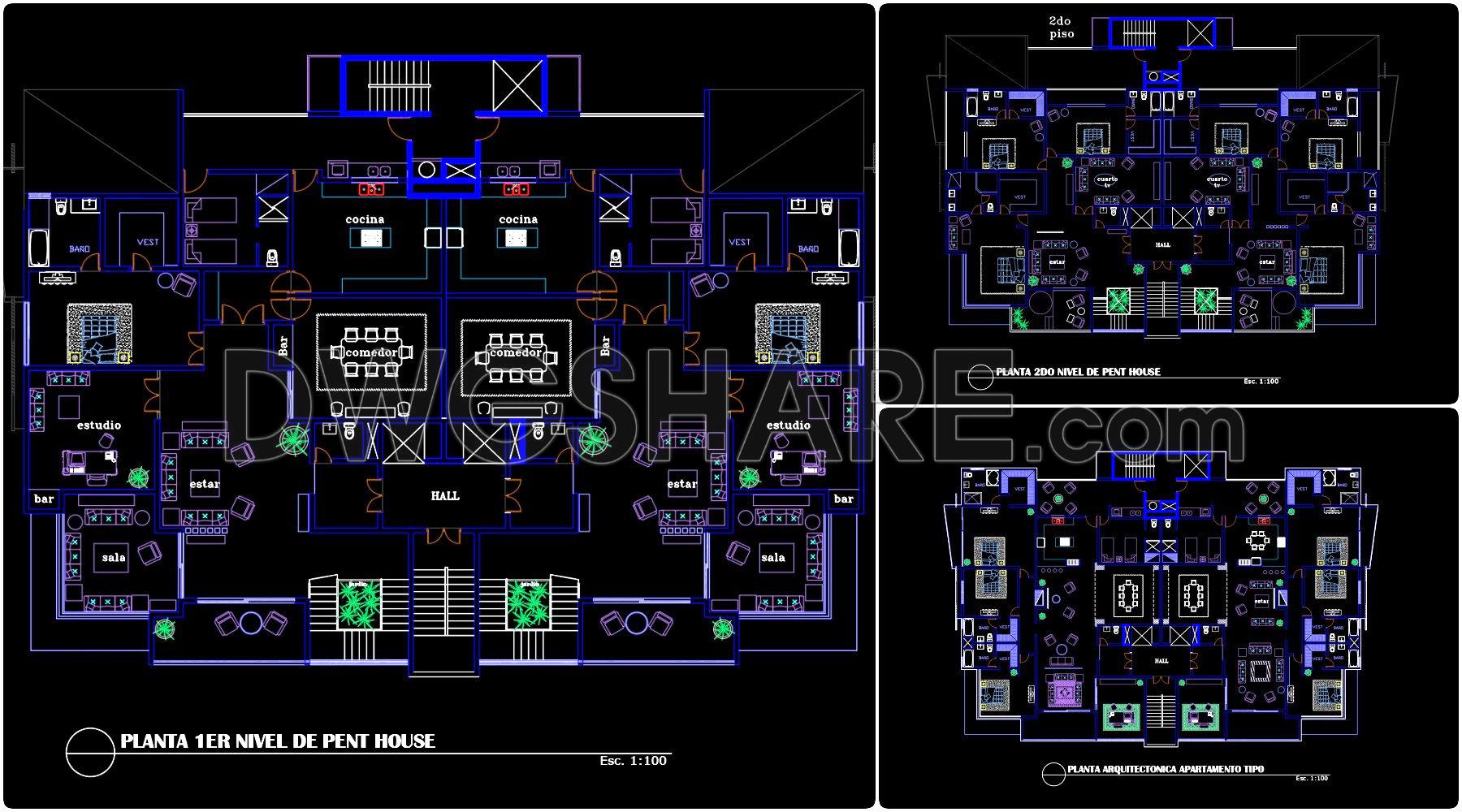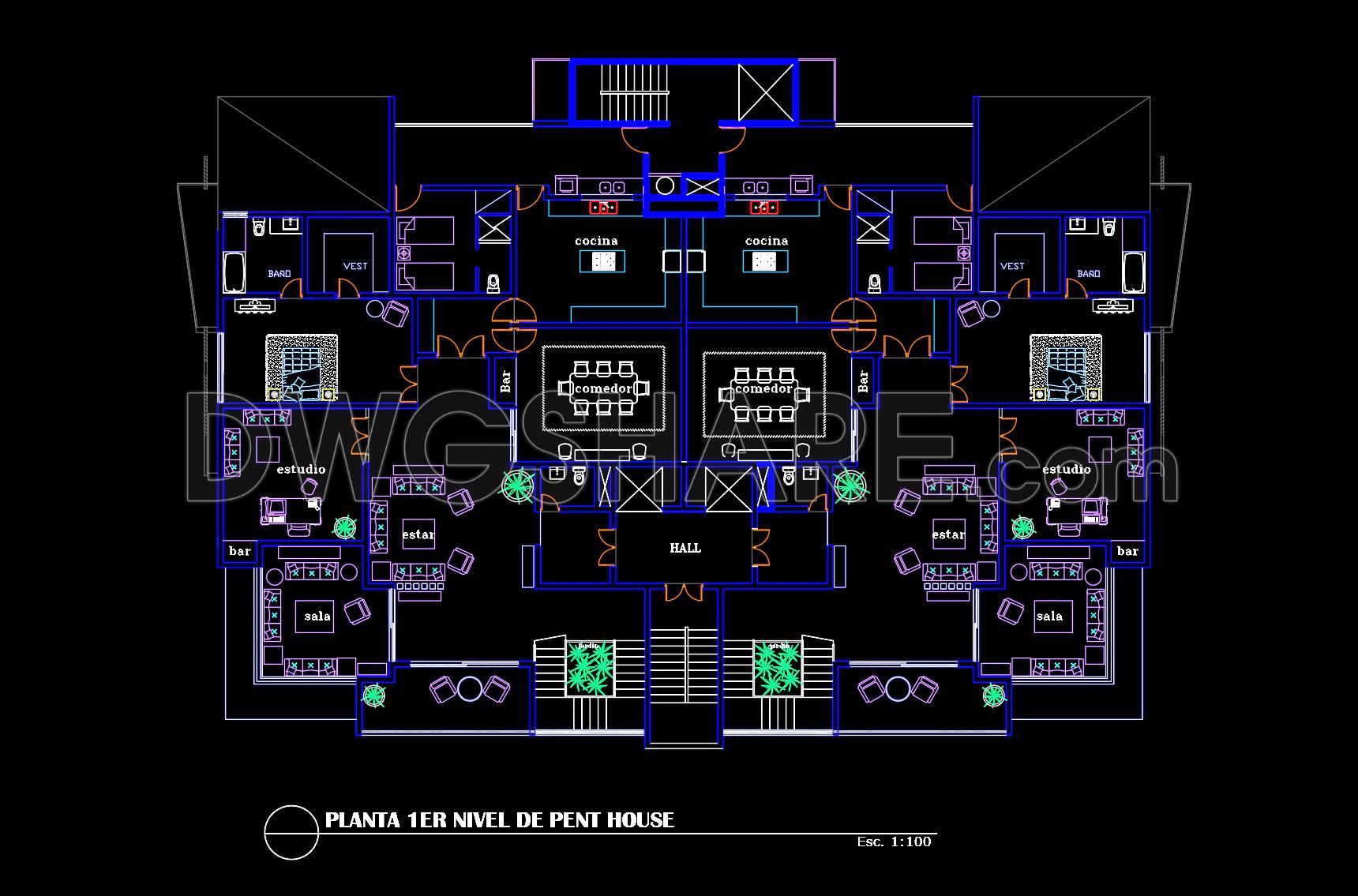 46. Free Download Penthouse Level 1 Floor Plan CAD Drawing – Symmetrical Apartment Layout