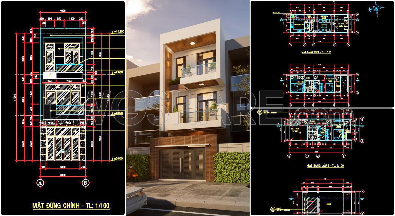 483. Download CAD Design Drawings for a 3-Story House with Dimensions 4m x 12.7m