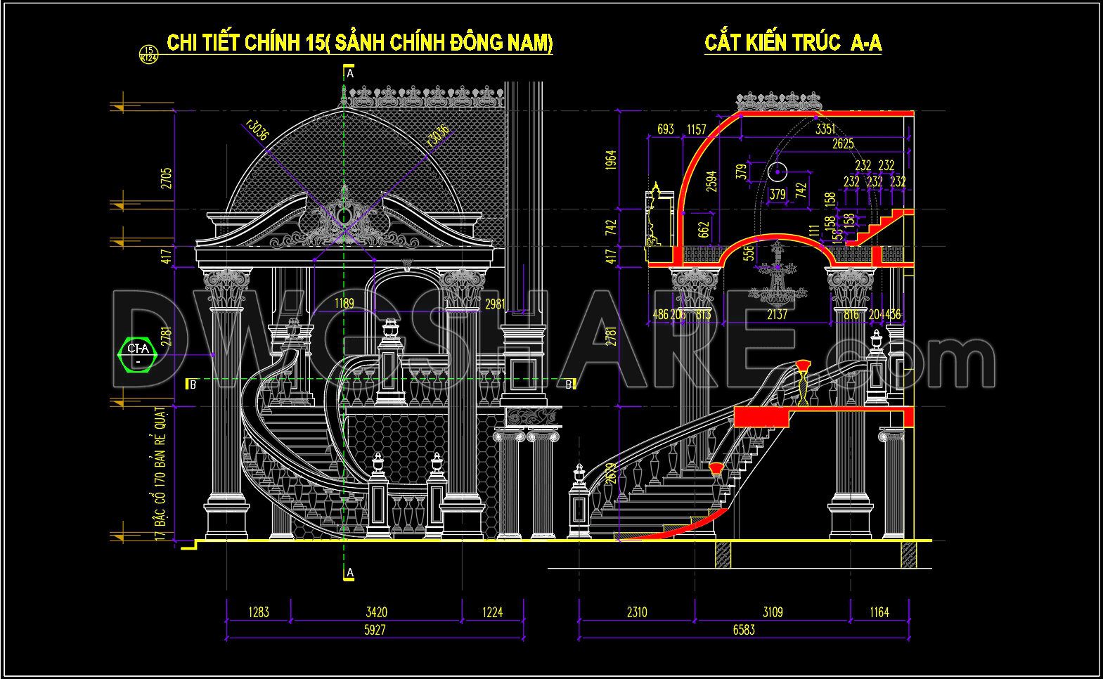 The CAD drawing showcases detailed architecture of a classical European-style main hall, featuring a grand curved staircase, elegant Corinthian columns, a semi-domed ceiling, and intricate decorative moldings. The drawing clearly presents dimensions, proportions, and ornamental structures with a luxurious royal aesthetic.