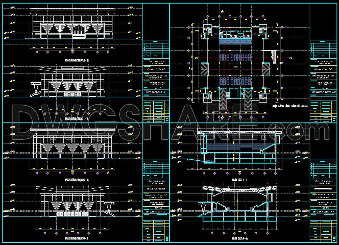 - Architectural Design: The documentation exhibits a rigorous approach to site planning and spatial organization. The project features a multi-level configuration with complex elevations, ranging from the underground parking facility (at the -7.000m mark) to the primary competition floor and spectator grandstands. The elevations and sections reveal a modern architectural language, utilizing extensive glass curtain walls and a gracefully curved canopy to harmonize aesthetic appeal with natural ventilation requirements.
