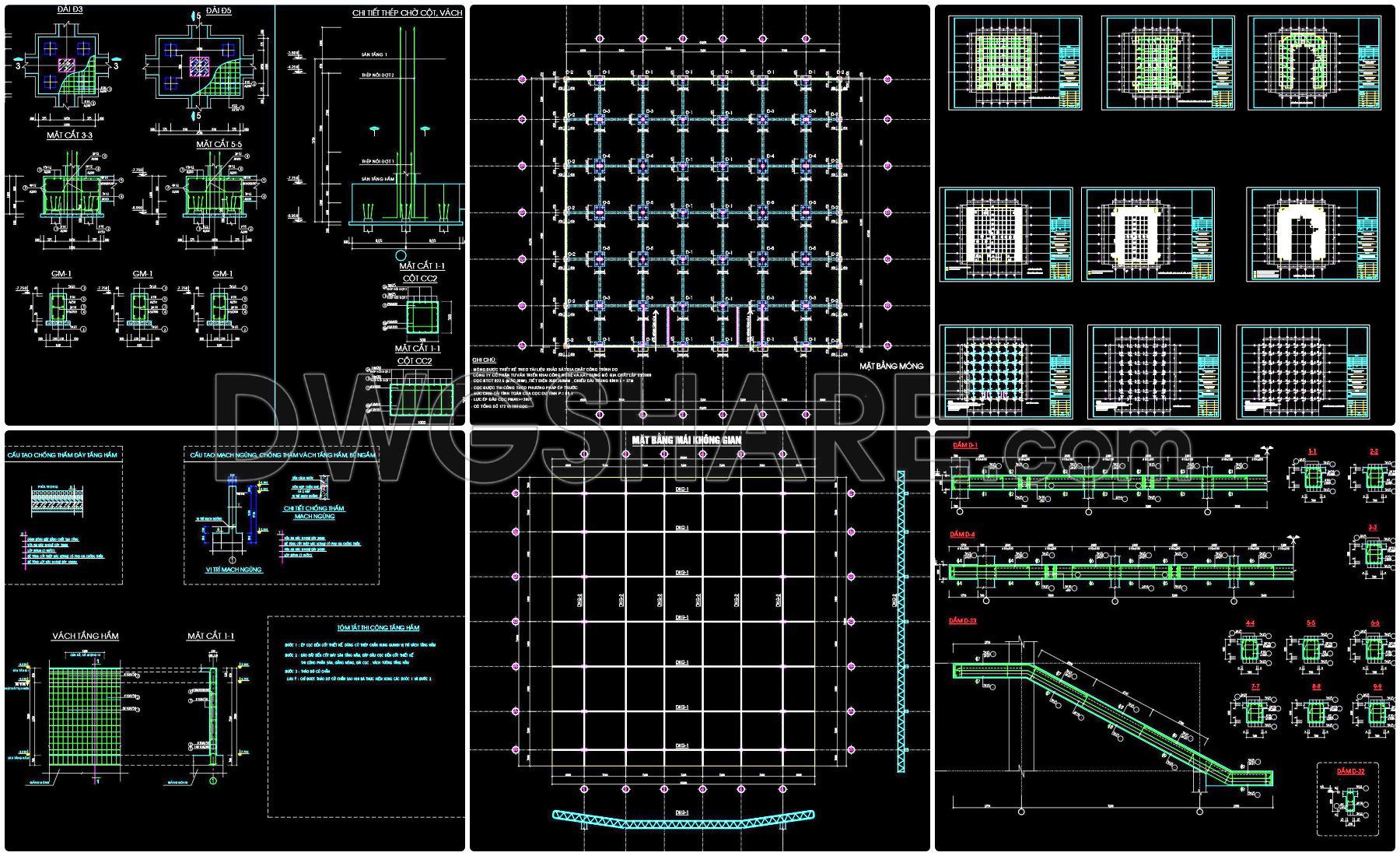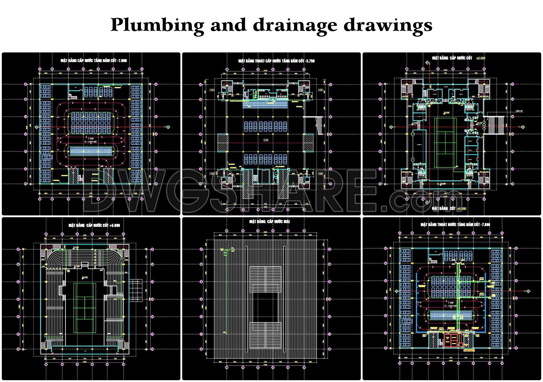 - Structural Engineering: The structural sheets demonstrate high precision in the design of the reinforced concrete (RC) pile foundations and the primary load-bearing framework. A critical engineering highlight is the large-span space frame roof system. This solution effectively eliminates internal columns over the playing area, ensuring completely unobstructed sightlines for the 1,500 spectators.