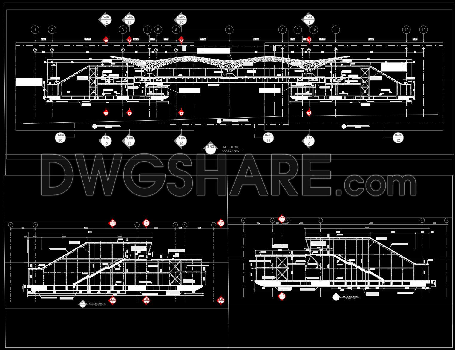 Explore the intricate details of architectural and curved roof structural drawings with these comprehensive CAD DWG files, available for free download. These drawings provide multiple perspectives of an advanced architectural project featuring curved roof structures designed for both aesthetic appeal and structural integrity. Key components include: