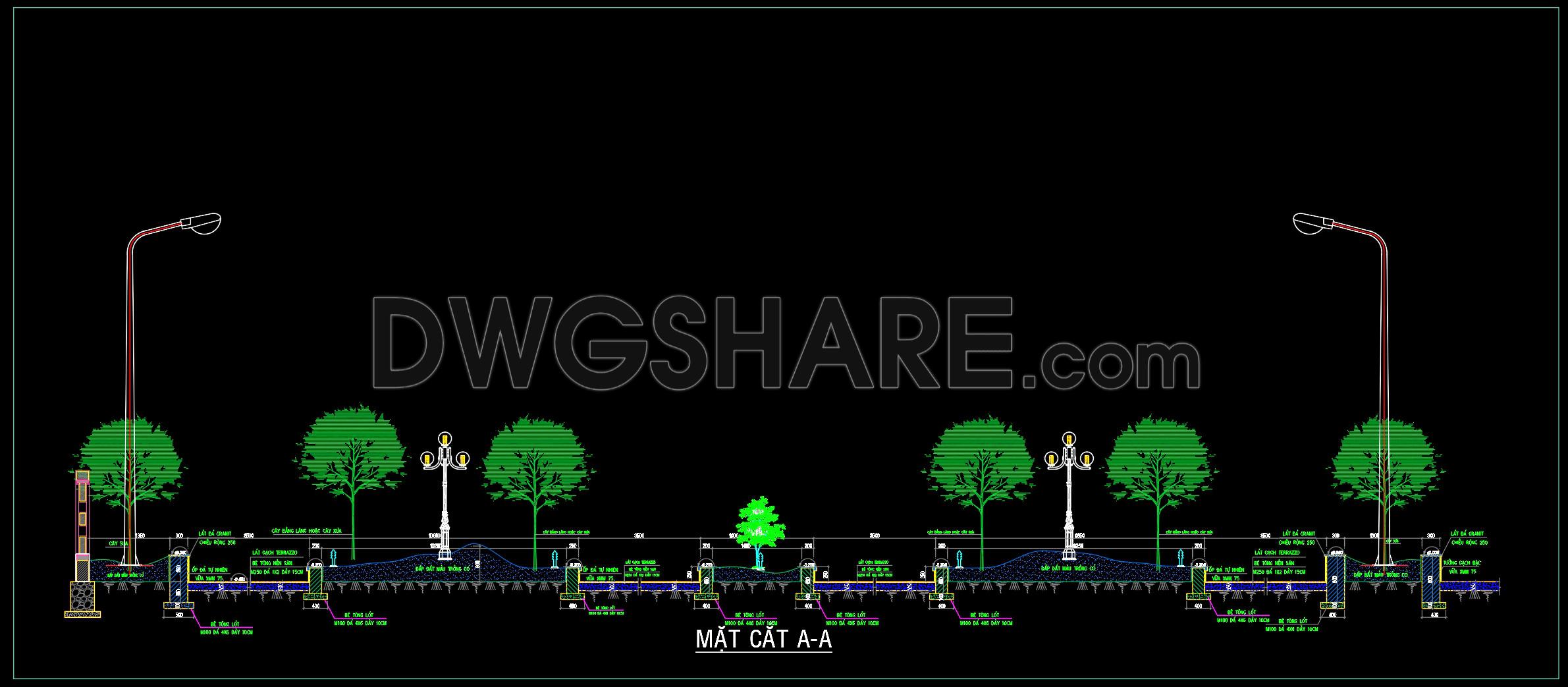 The CAD drawings available for free download showcase a comprehensive road landscape design highlighting technical infrastructure and lighting elements. This detailed Section A–A perspective provides a cross-sectional view essential for urban planning and civil engineering projects. The drawings include various components such as: