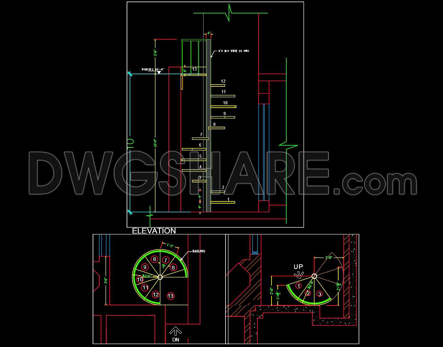 673. Spiral Steel Staircase Plan and Elevation Drawing (CAD DWG)