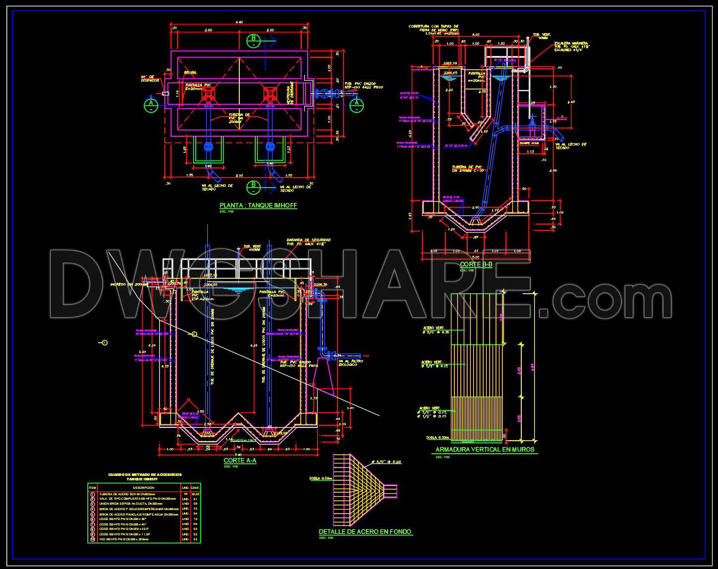 The Imhoff Tank Wastewater Treatment Section Details CAD Drawing showcases essential plans and sections integral to the design and construction of an Imhoff tank structure. These architectural and structural drawings are meticulously crafted to guide professionals in developing efficient wastewater treatment solutions.