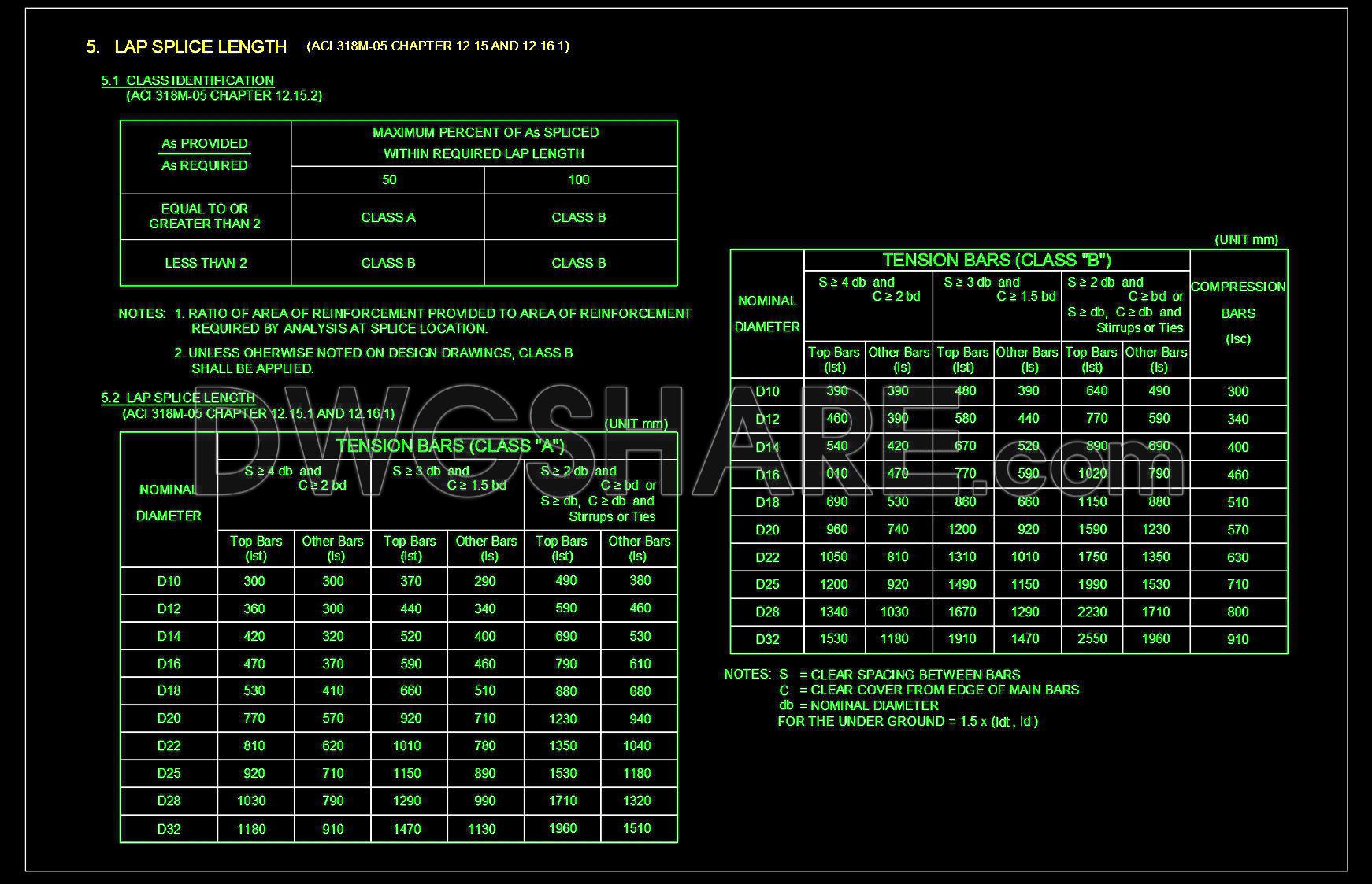 681. Rebar Lap Splice Length Details Based on ACI 318M CAD DWG