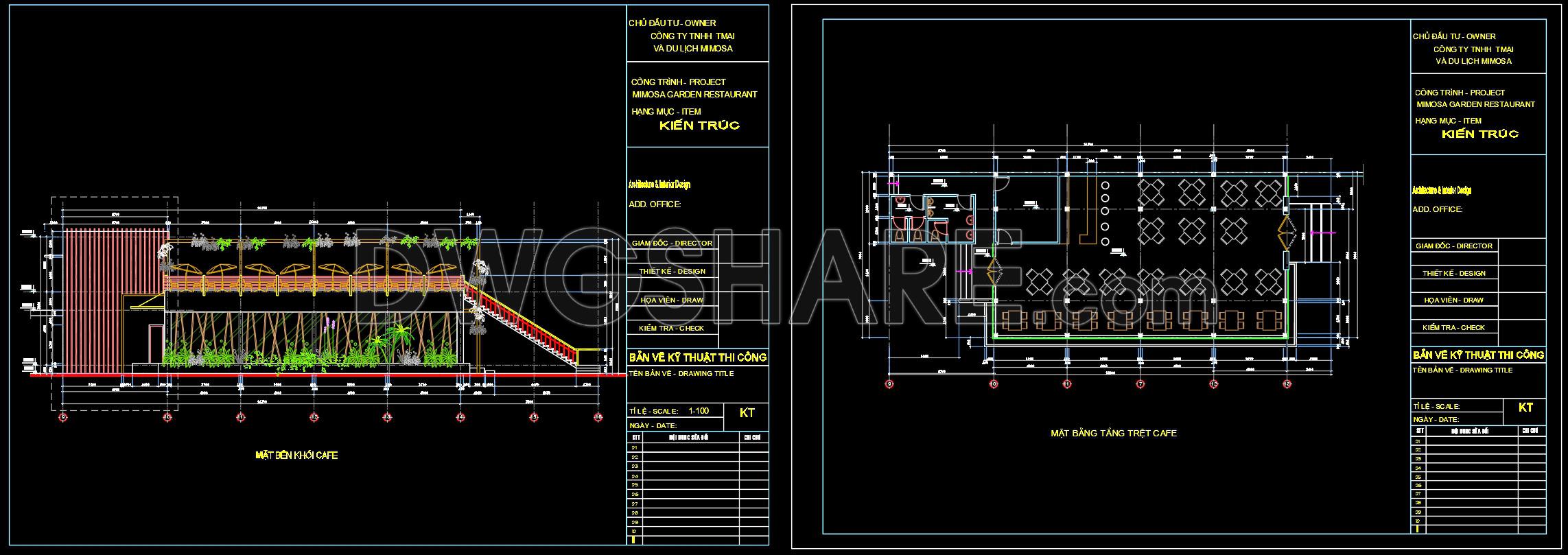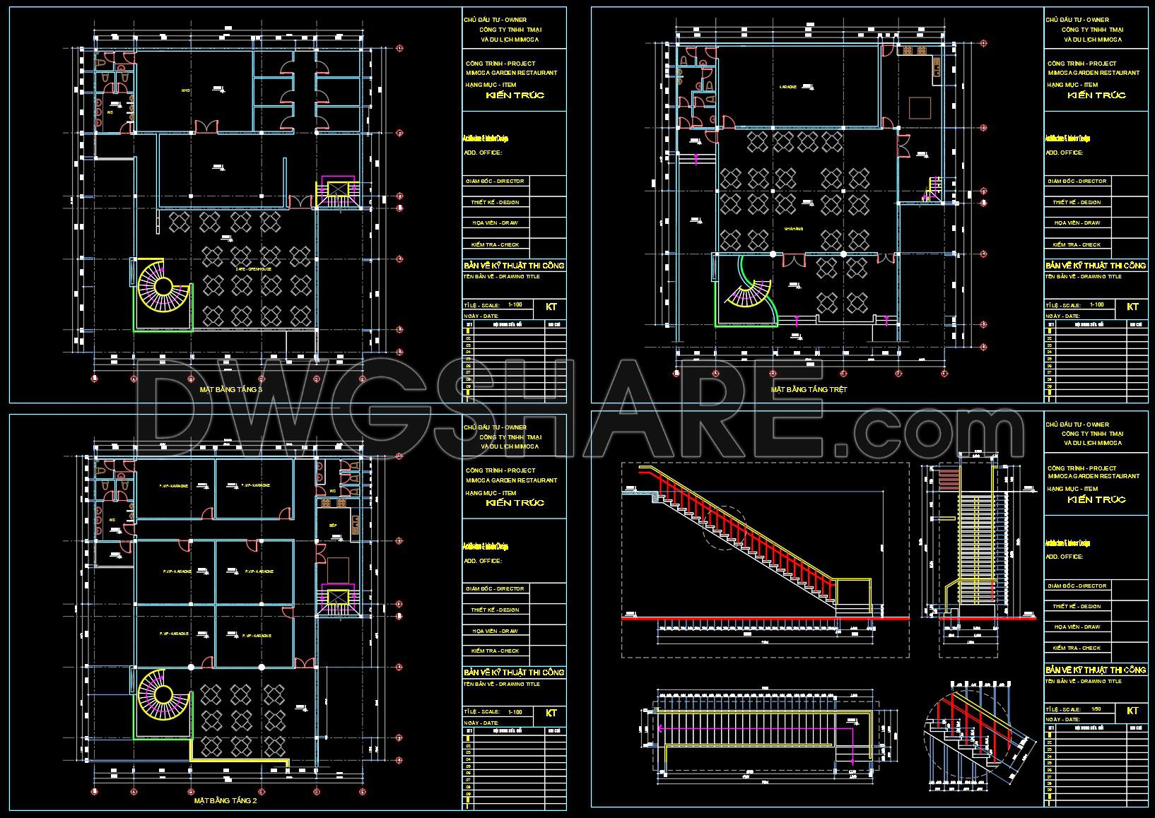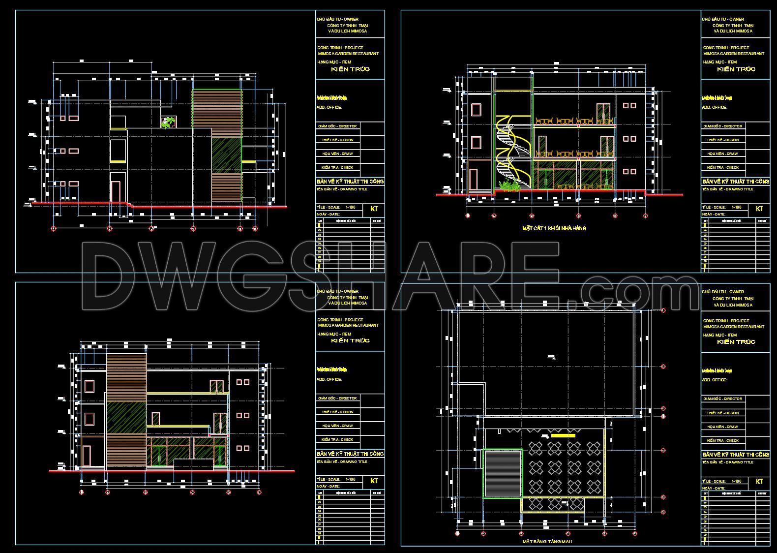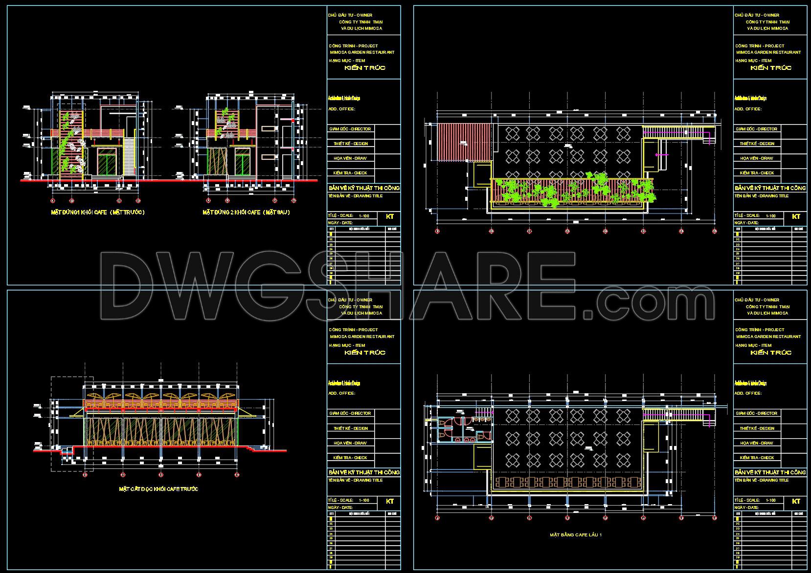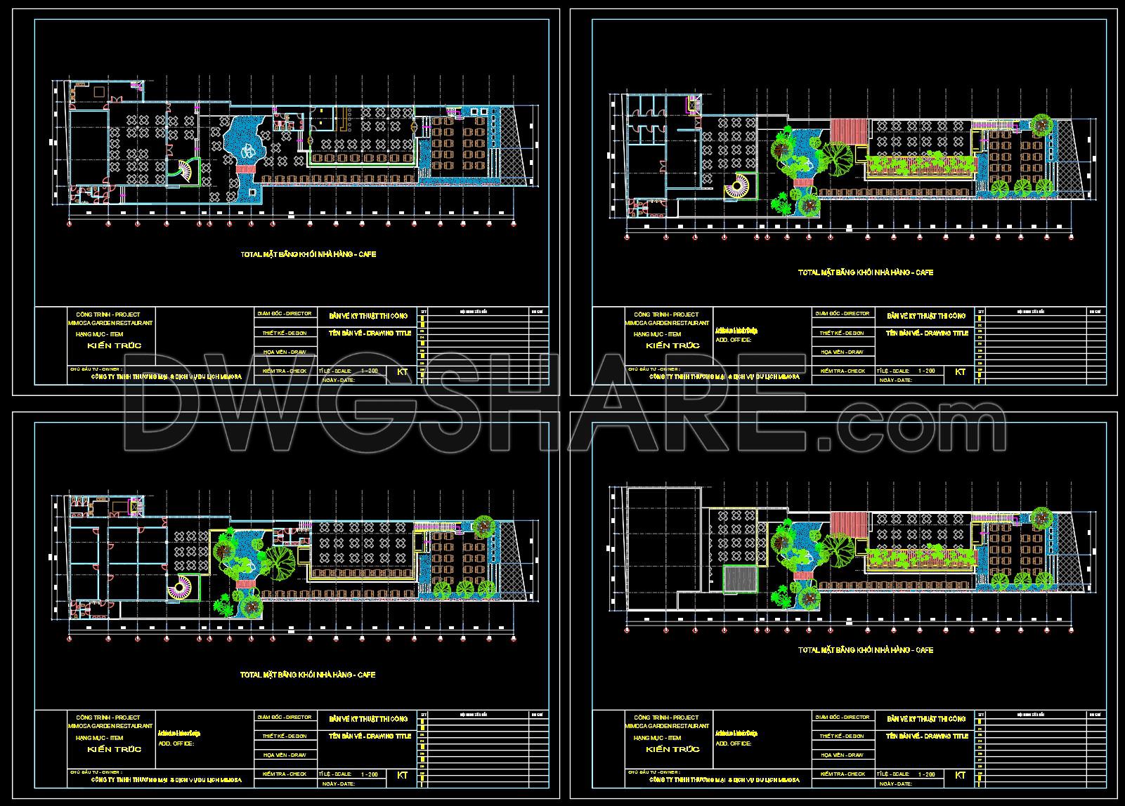 This CAD drawing presents the overall architectural site plan of the Mimosa Garden Restaurant and Café, clearly illustrating the spatial organization and functional layout of the project. The drawing includes detailed zoning of indoor dining areas, outdoor café spaces, landscaped gardens, walkways, and service zones, ensuring a logical and efficient circulation system. Green spaces are carefully integrated with seating areas to create a harmonious relationship between architecture and landscape, enhancing user experience and visual comfort. The plan also shows key elements such as staircases, sanitary areas, storage spaces, and technical rooms, supporting both customer use and operational needs. With accurate dimensions, grid lines, and standard architectural symbols, this drawing is suitable for reference in architectural design, interior planning, and landscape coordination. It is especially useful for architects, interior designers, and students looking for real-world examples of restaurant and café layout design. The CAD file can be used for study, concept development, or adaptation to similar hospitality projects.