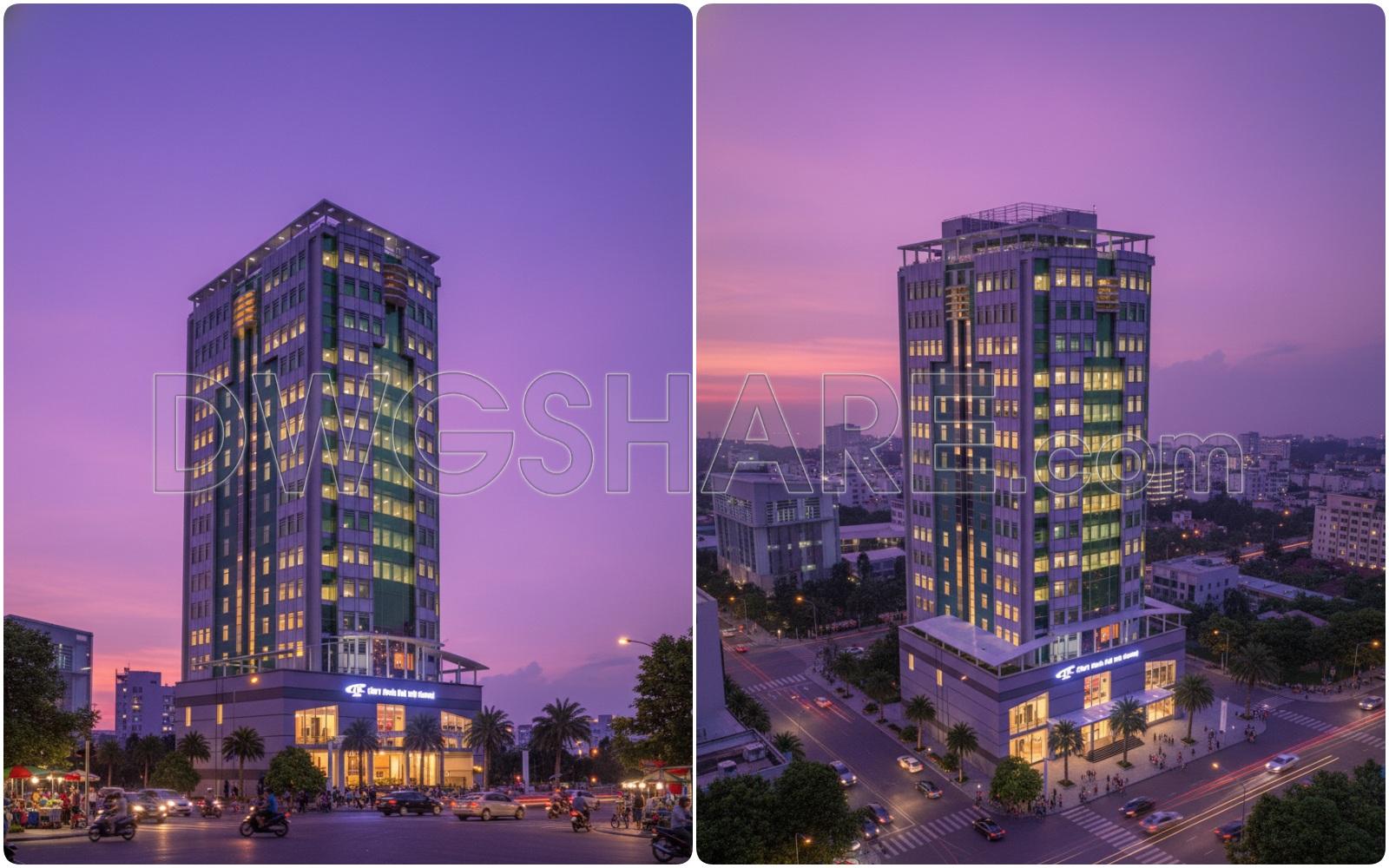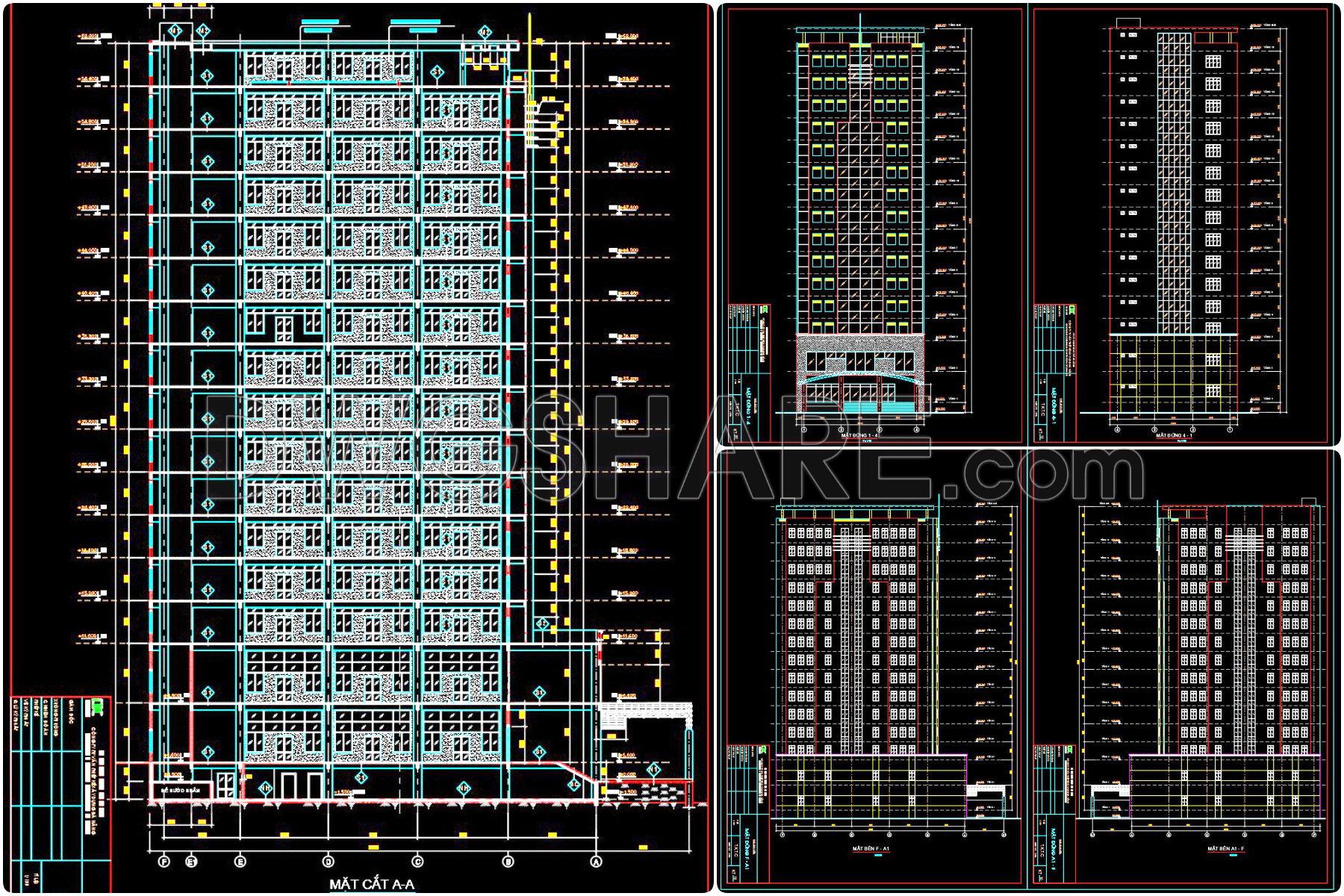 The drawings provide clear dimensions, elevations, architectural symbols, and structural elements, making them suitable for reference in office building planning, technical design development, and construction documentation.