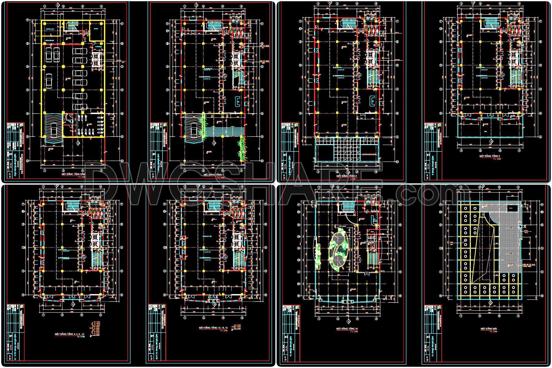 75. Free Download CAD Drawings – Basement & 16th Floor Office Building Plans (Parking Layout, Vertical Core, and Functional Zoning)