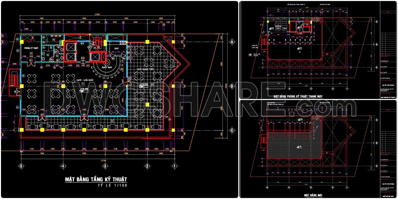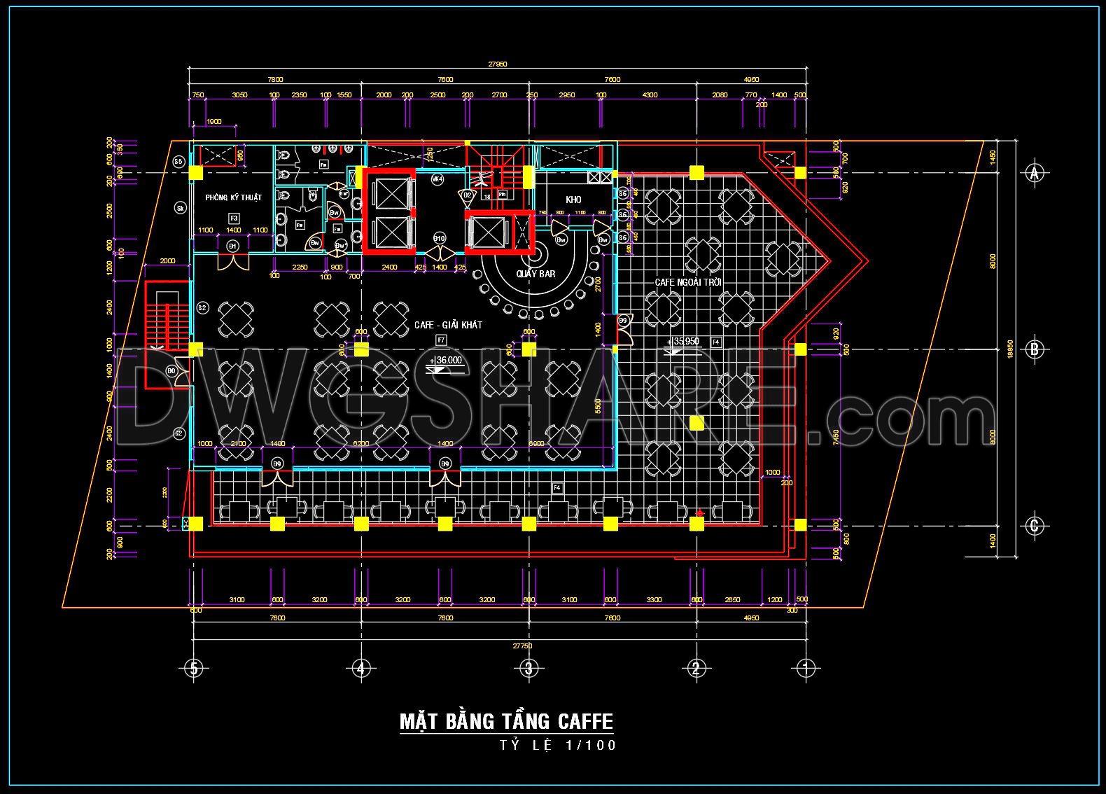 This CAD drawing shows a cafe floor plan with a clear and well-organized layout that is easy to apply for construction. The design includes an indoor cafe & refreshment area, an outdoor seating zone, a central bar counter, storage room, technical room, restroom block, stairs, and elevators. Tables and chairs are arranged efficiently to maintain smooth circulation and support high customer capacity. Structural columns, perimeter walls, floor levels, and detailed dimensions are fully presented at scale 1/100, making the drawing suitable for architects, engineers, and investors as a reliable reference. This plan helps optimize functional zoning, control usable area, and support the development of a modern, professional coffee shop design.