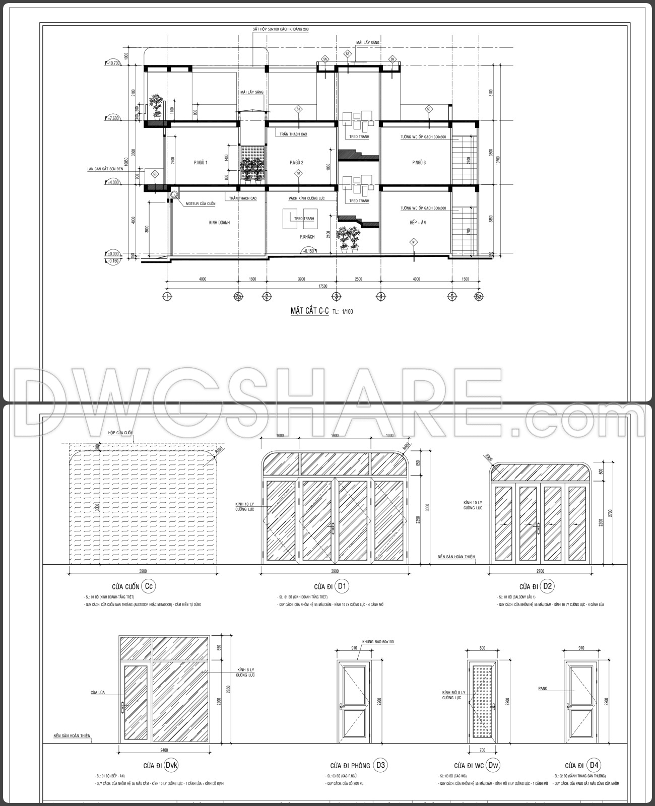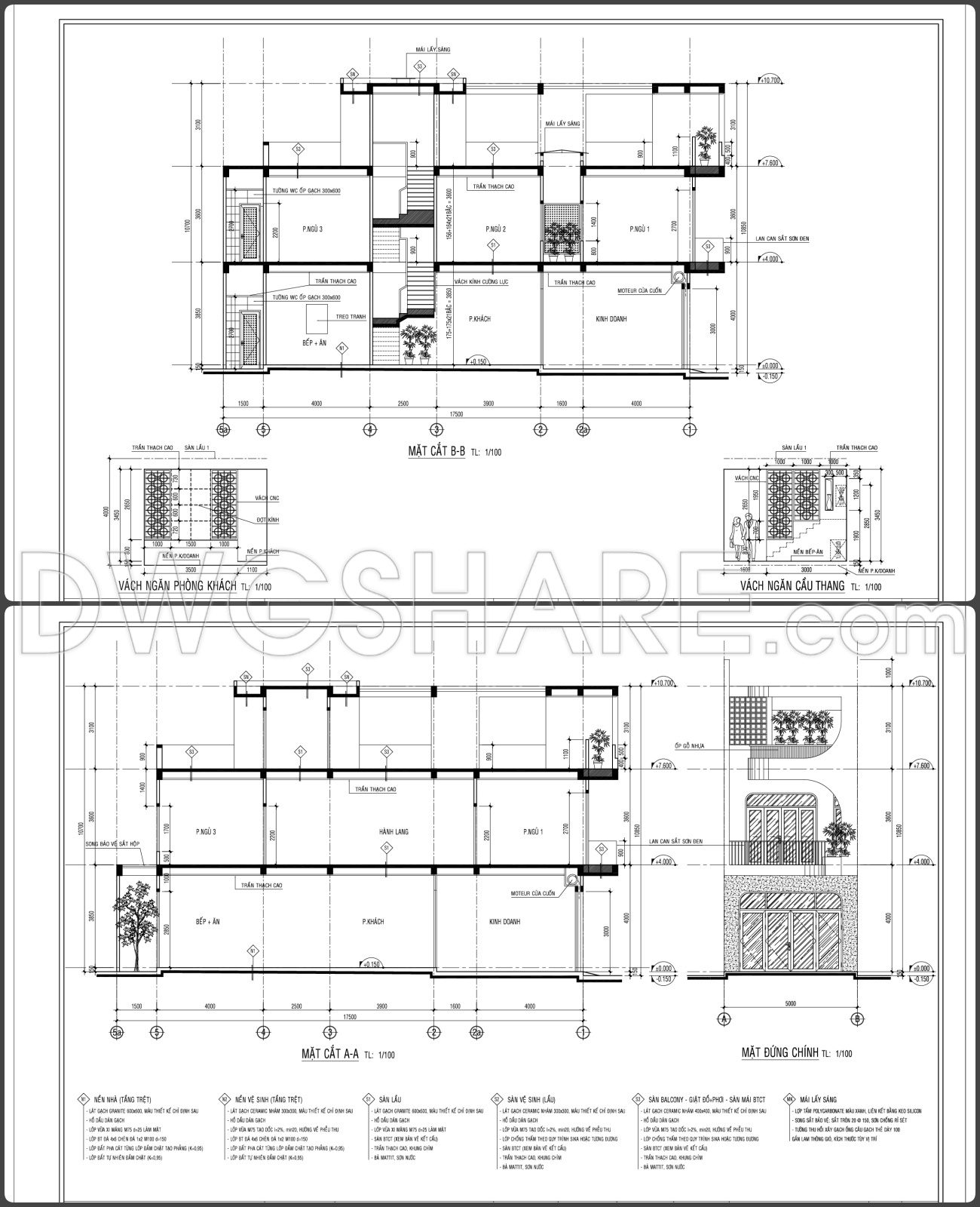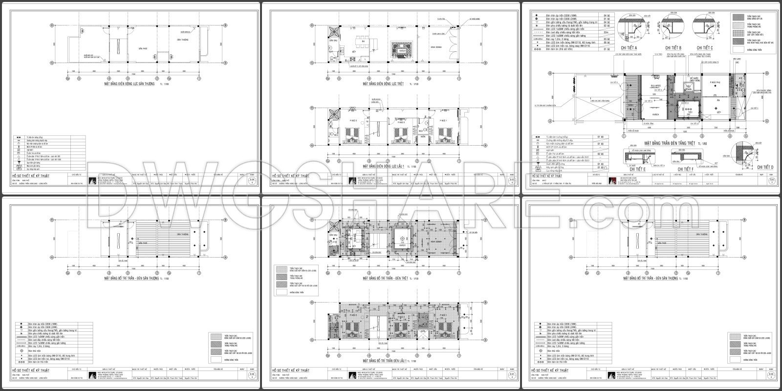 This drawing set includes all necessary components for the construction of a residential project. It is presented in Vietnamese, utilizing standard technical dimensions and symbols.