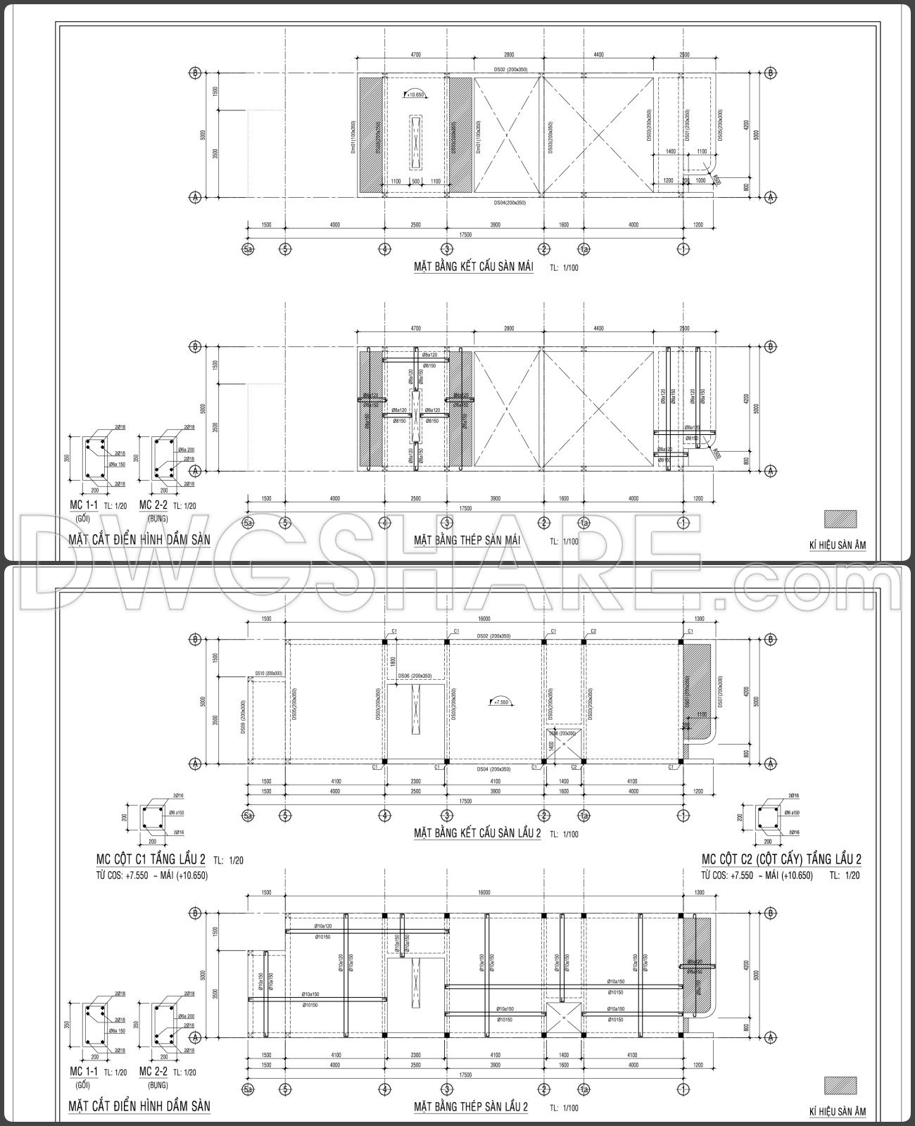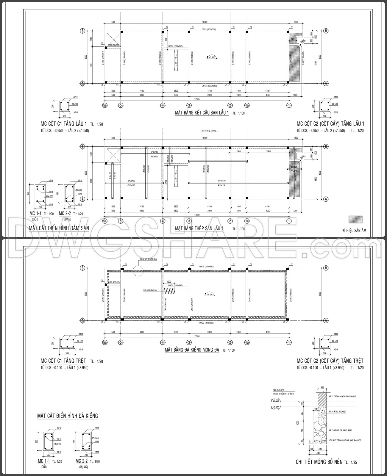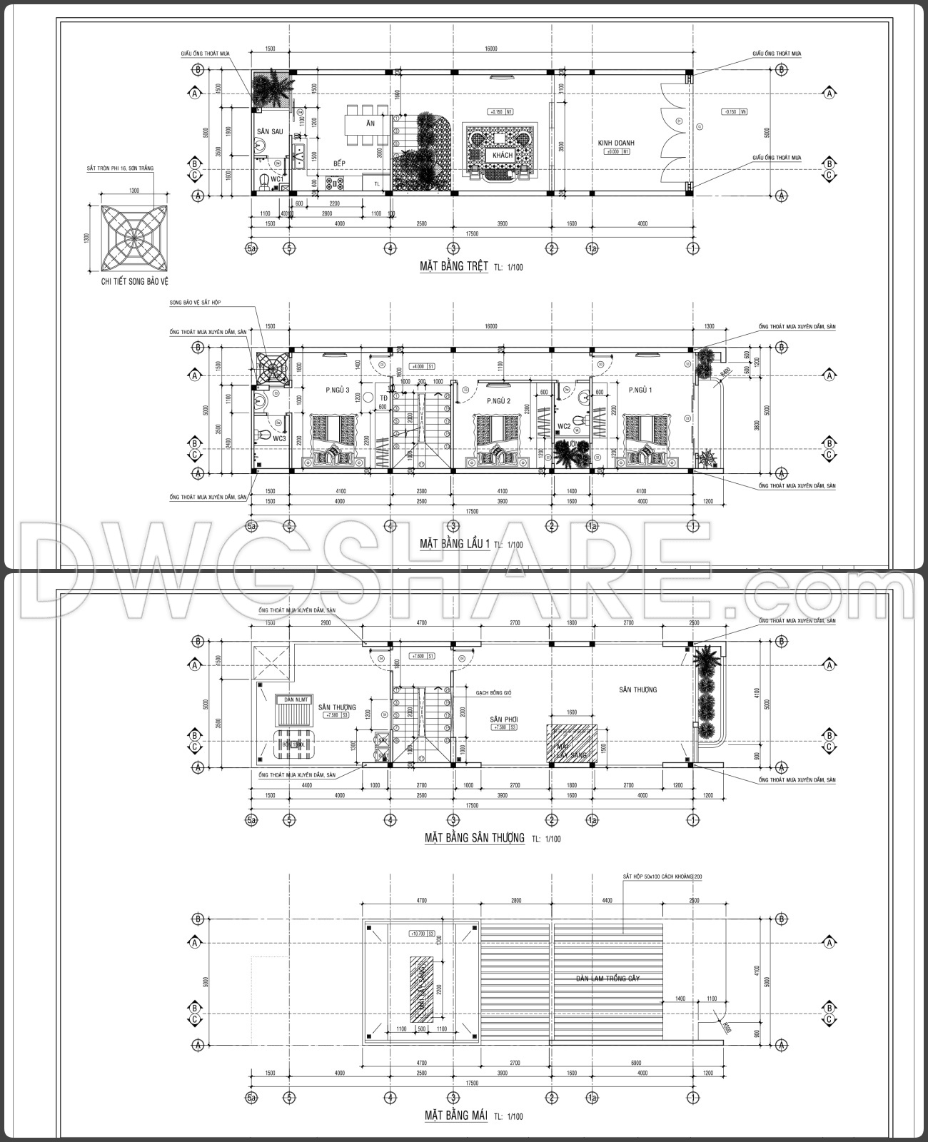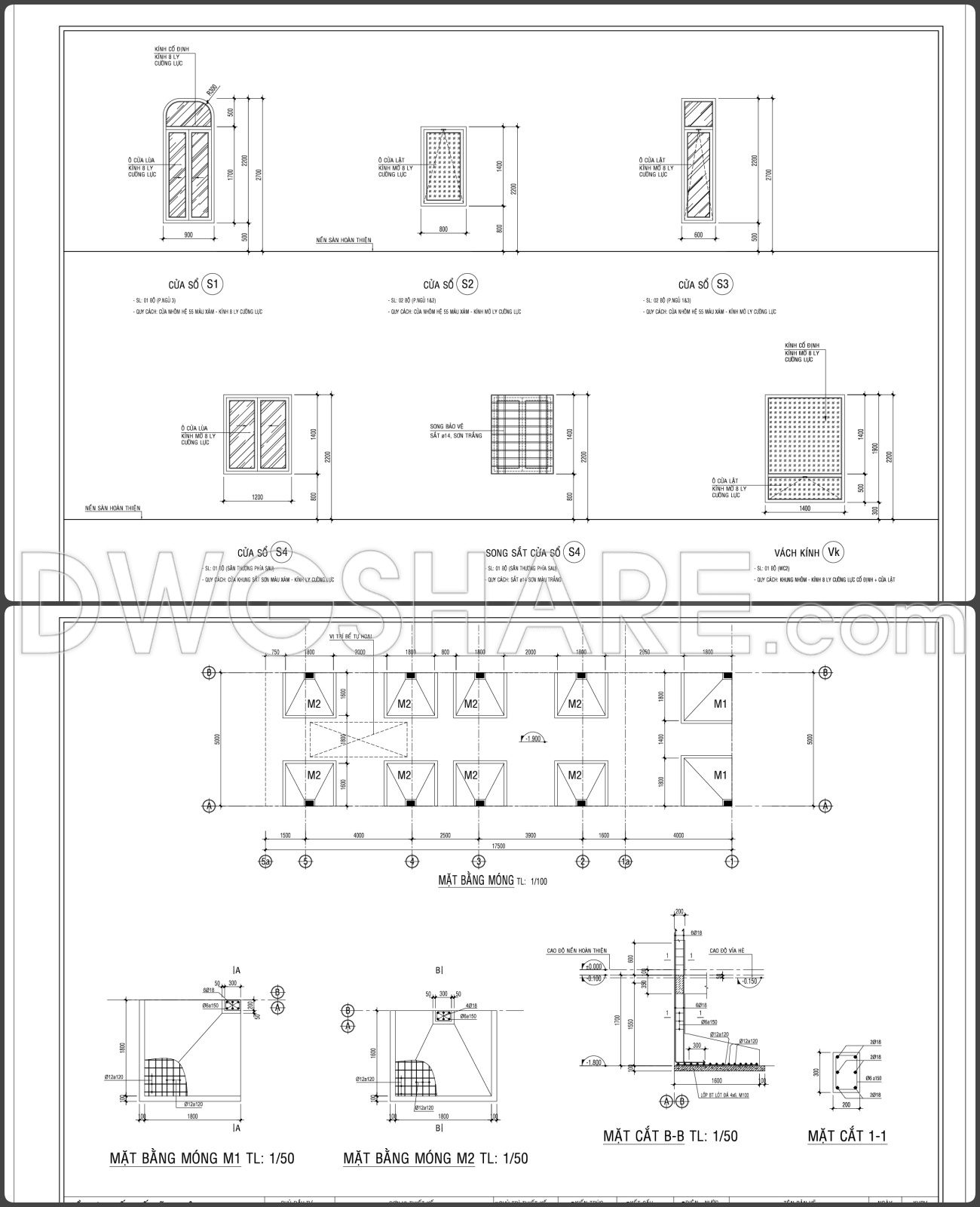 This drawing set includes all necessary components for the construction of a residential project. It is presented in Vietnamese, utilizing standard technical dimensions and symbols.