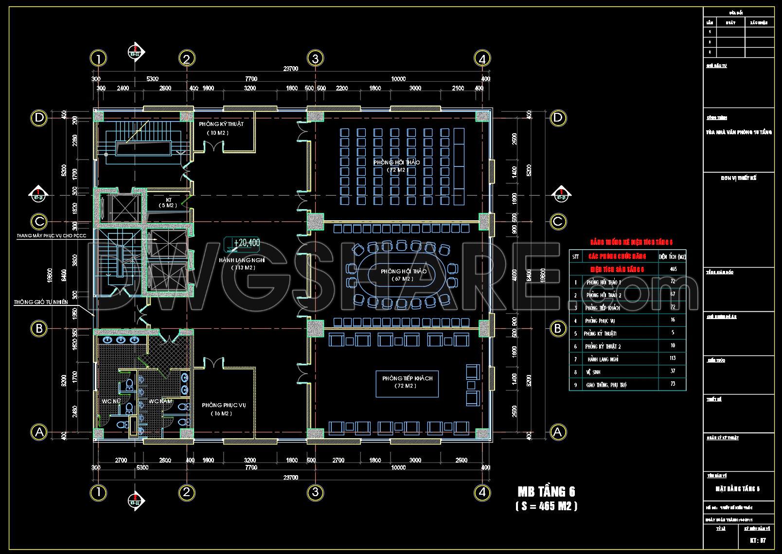 This CAD drawing illustrates the 6th floor layout of an office building, with a total floor area of 465 m². The plan focuses on conference and meeting functions, including a large conference hall, a medium-sized meeting room, and a reception room arranged along a central circulation corridor.
