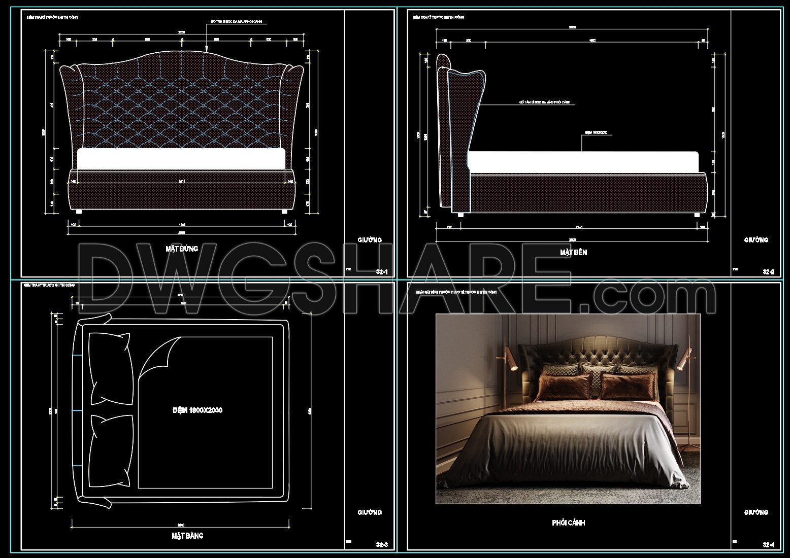 This series of CAD drawings provides detailed bed design plans with comprehensive views, including 3D renderings. The primary subject is a sophisticated bedroom design, featuring a modern bed with a tufted headboard. Key components include: